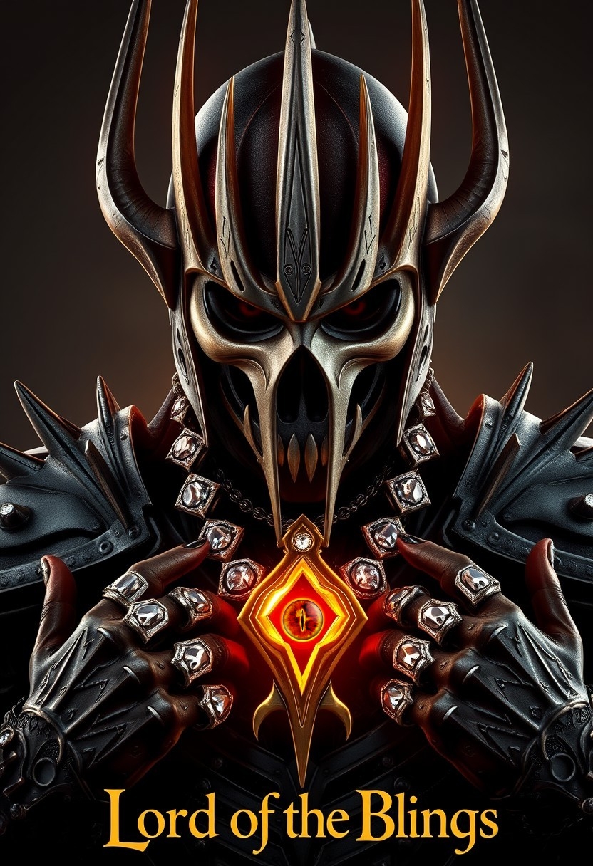 Sauron is showing his jewelry. He is wearing rings. (large necklace that is depicting a fiery eye:1.4). helmet has straight and long blades pointing up, and has two nose holes that resembles the nose of a skull, no mouth and shallow eyes. The armor is black and evil with sharp edges and spikes. All the jewelry has diamonds that glitters and shines. (Golden text "Lord of the Blings" at bottom:1.3). Inspired by Tolkien, hyperrealistic, very detailed, UHD.