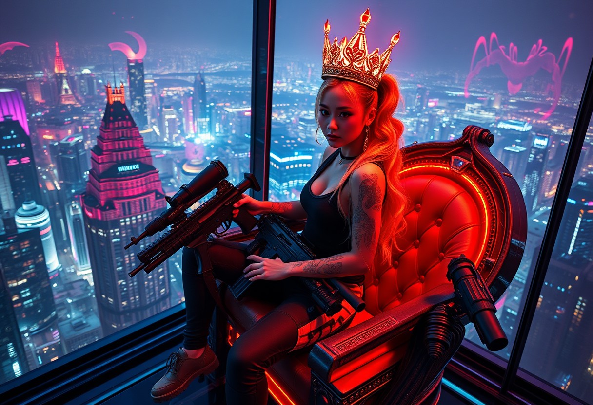 Cinematic shot of a 28 year old Chinese girl, beautiful, sexy, alluring, fit, flowing two-tone hair, blonde with red highlights, wavy hair ponytail, tattoos, carrying many weapons of a cyberpunk era, wear cyberpunk pants and tanktop. Sitting on a throne on the top most floor of the tallest skyscraper. Wearing a neon-lit lightweight crown on her head. Royalty. Rich. Colorful and expensive outfit. Glass floor, glass window. Entire futuristic cyberpunk skyline must be visible. Neon colours and lighting everywhere. Every element of the photo must be cyberpunk related. Impactful atmosphere in 8k resolution with intricate skin texturing. Angry. Ultrarealistic. absurdres. Pheonix. colorful. wallpaper. huge filesize. RAW photo.