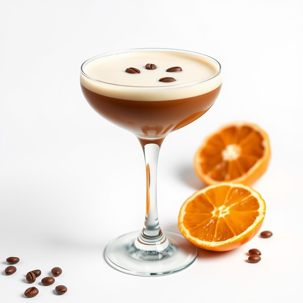 simple product Photography image on a plain, blank, pure 100% bright white background of a foamy espresso martini in a large coupe glass and 3 floating coffee beans as garnish. and cut orange beside it. zoomed out.