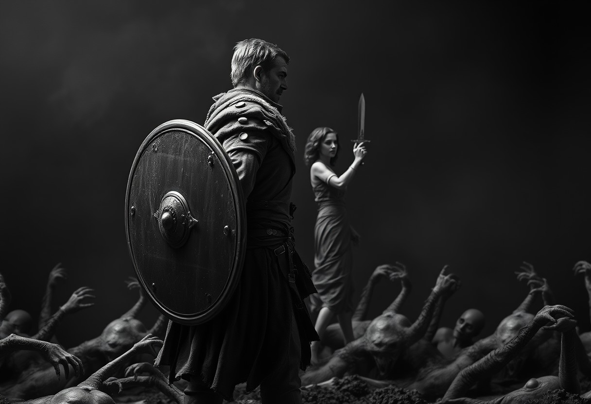 In a dark, eerie landscape, side view of an unarmed weary man holding just a shield and behind him, a small demonic woman. his large, battle-scarred shield raised to defend against a horde of ghoulish creatures clawing at him. The man is unarmed and focused entirely on defense, his tattered clothing showing the scars of countless battles. Just behind him, a much smaller woman figure, dressed in fine, elegant clothing and high heels, crouches behind the man. Her expression is filled with spite, anger, and betrayal. as she quietly prepares to plunge a gleaming dagger into his back, ready to betray him. The scene is highly detailed and photorealistic, with the only vivid color coming from the reflective dagger, contrasting against the bleak monochrome surroundings. 14mm wide angle photojournalist