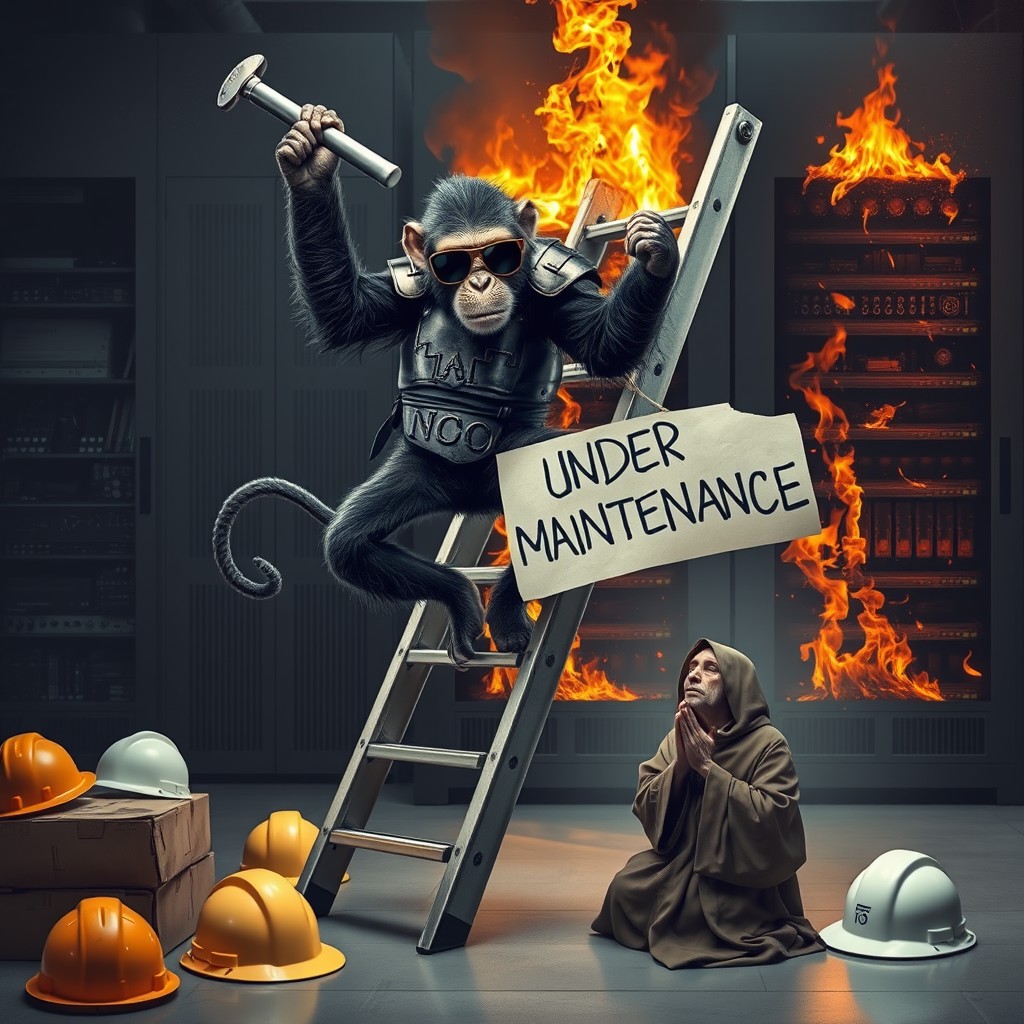realistic, realism, surreal, monkey wearing sunglasses in armor holding a wrench, breakdancing up side down on a step ladder, in front of burning server machine, server is on fire. there are hard hats and pizza boxes on the floor, a monk is kneeling in prayer on the floor. a paper sign on the ladder say "UNDER MAINTENANCE\nEVERYTHING IS FINE"