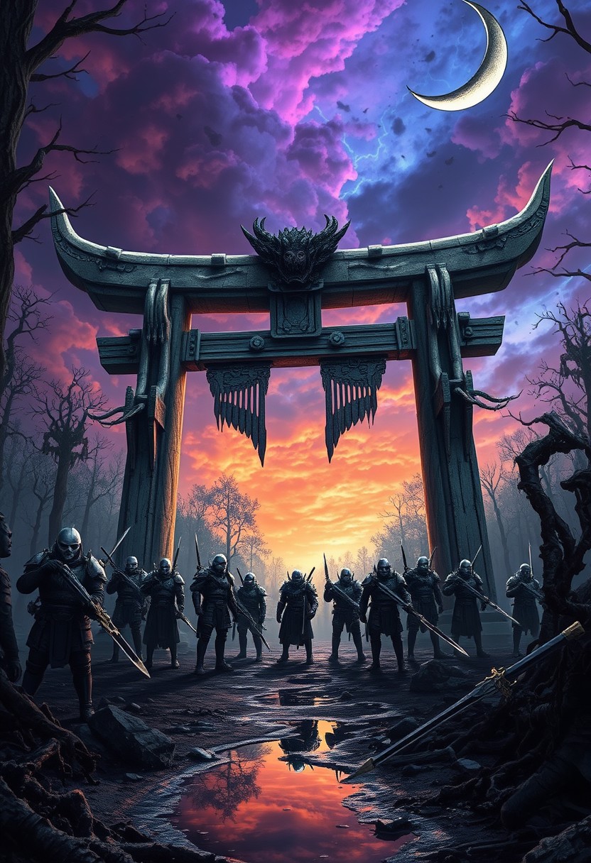 In the heart of a decaying forest, a towering torii gate rises—an unsettling fusion of bone, sinew, and cold metal, as if birthed by the earth itself. This grotesque gate marks the entrance to a temple twisted by time, where stone and flesh merge in nightmarish harmony. Above, the sky churns with bruised purples, molten oranges, and electric blues, as if reality itself is unraveling. Beneath this apocalyptic sky, a group of warriors gathers. Clad in biomechanical armor that melds with their bodies, they are part human, part machine. Their faces are hidden behind masks of bone and chrome, eyes cold and determined. Their weapons, grotesque extensions of their bodies, pulse with dark energy, alive with sinister intent. The air is thick with decay, as if the forest itself watches through unseen eyes. A nearby pool of viscous liquid mirrors the chaotic sky and distant battle’s flickering lights. The crescent moon, sharp and metallic, casts fragmented shadows that twist across the ground like living creatures. The forest hums with an ominous sound, like ancient machines ticking in the darkness. Twisted trees reveal glistening, fleshy interiors, and skeletal structures rise in the distance, etched with cryptic symbols. The warriors exchange silent glances, their movements precise and disturbingly organic. Together, they advance toward the temple's gaping maw, ready to face the biomechanical horrors within and inscribe their names into this twisted reality.
