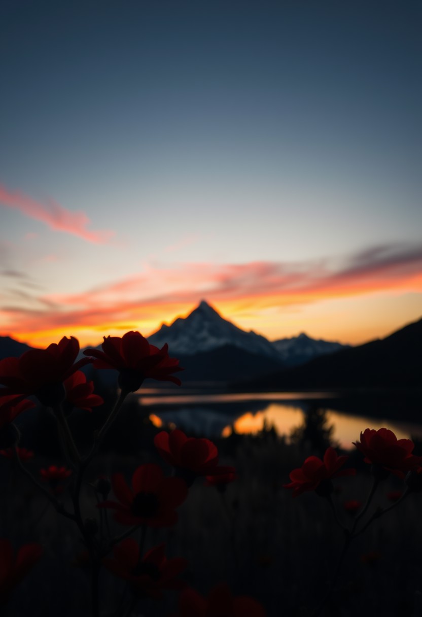 The image is a beautiful sunset with vibrant red flowers in the foreground and a majestic mountain range in the background. highly detailed and hyper realistic photo, by Alena Aenami , by Archibald Thorburn , by Daniele Afferni , in the style of monochromatic silhouette reflection, limited dark palette, unusual dark colors, faded colors, atmospheric haze, highly dramatic cinematic lighting, motion blur, film grain, professional, excellent composition, finest details, maximized details, ultimate detail level, masterpiece, best quality