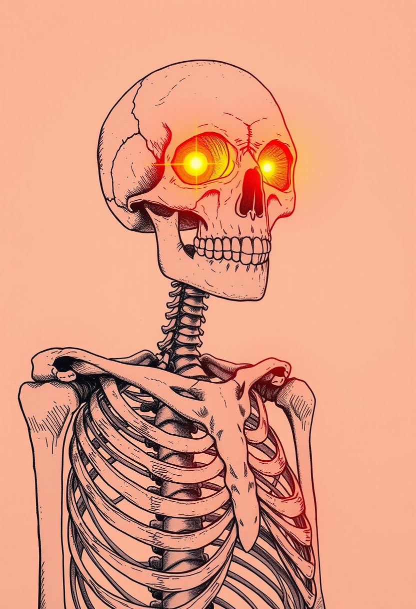 single continuous minimal ink drawing skeleton with glowing eyes, warm orange and pink hues casting a beautiful glow, cinematic lighting, detailed digital painting by Aaron Blaise and Robert Bateman and Carl Runguis, 4k resolution, hyperrealistic rendering, ethereal atmosphere
