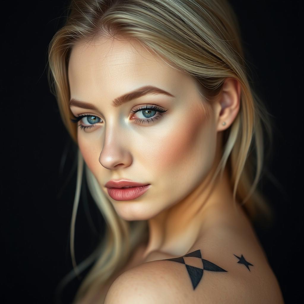 Minimalist tatoos on a beautiful blonde woman. realistic skin with pores and minor imperfections, studio background, hyperrealistic, professional photography, bokeh