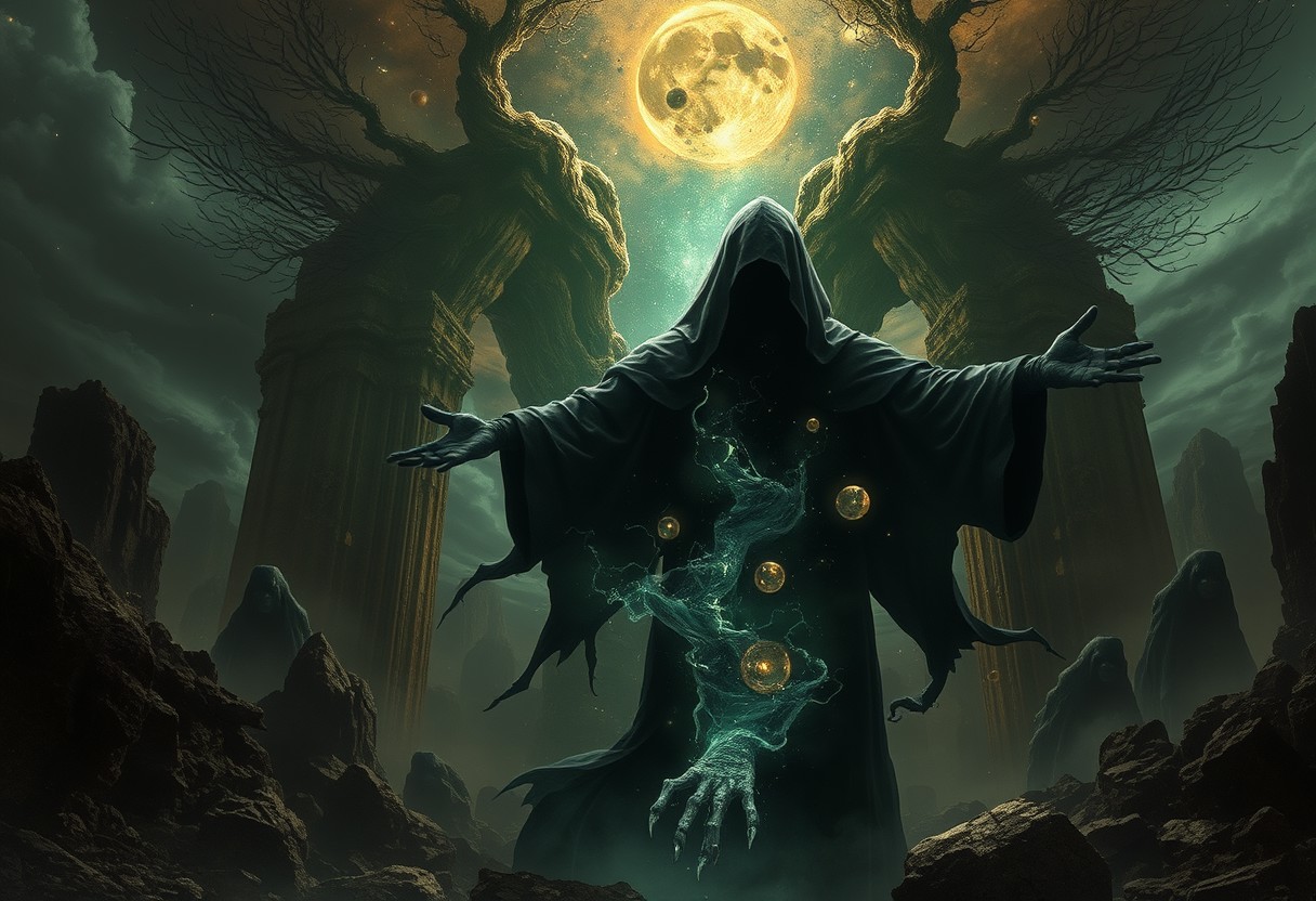 A universe inside a dark cloaked figure within mysterious landscape in an unfathomable realm of fantastic creation inhabited by ancient shadows of a forgotten time beyond the gate of the gateless gate where life is limitless, light is shadow and shadow is light, eerie sense, horror, spark of the beginning, existence and nonexistence at once, ethereal, outstretched arms, behold the end of the beginning, inglorious glory to the dark one, betrayal of the ancient order, beware the 7headed beast, destroyer of the old ways, bearer of the unbearable, nightmarish, archaic runes, tree aging backwards, breath of the gods, ruins of a place unimagined, extreme intricate detail, photorealistic, beyond epic scene, fate discarded, unseeable face of god, the end is the beginning, the beginning is the end, man arises as god dies, as above so below, as below so above, emerald tablet, thoth, guardian and saboteur of existence, hopeless hope, ghosts of the unborn, conception of the inconceivable, cosmic well of imperceptible perception, evil aura, infinite emptiness, pillars of void, overwhelming subtlety, abstract sacred geometry, beams of readiness without intention, gift of doom, despair of the ages, hidden secret warnings from dead gods, carved by the conductor of unholy loneliness of time incarnate, consumed by the night itself, beautiful tragedy of hellish discovery, unraveling mist of unreal reality, philosophers stone, proclaim the nameless name of collapsed eternity