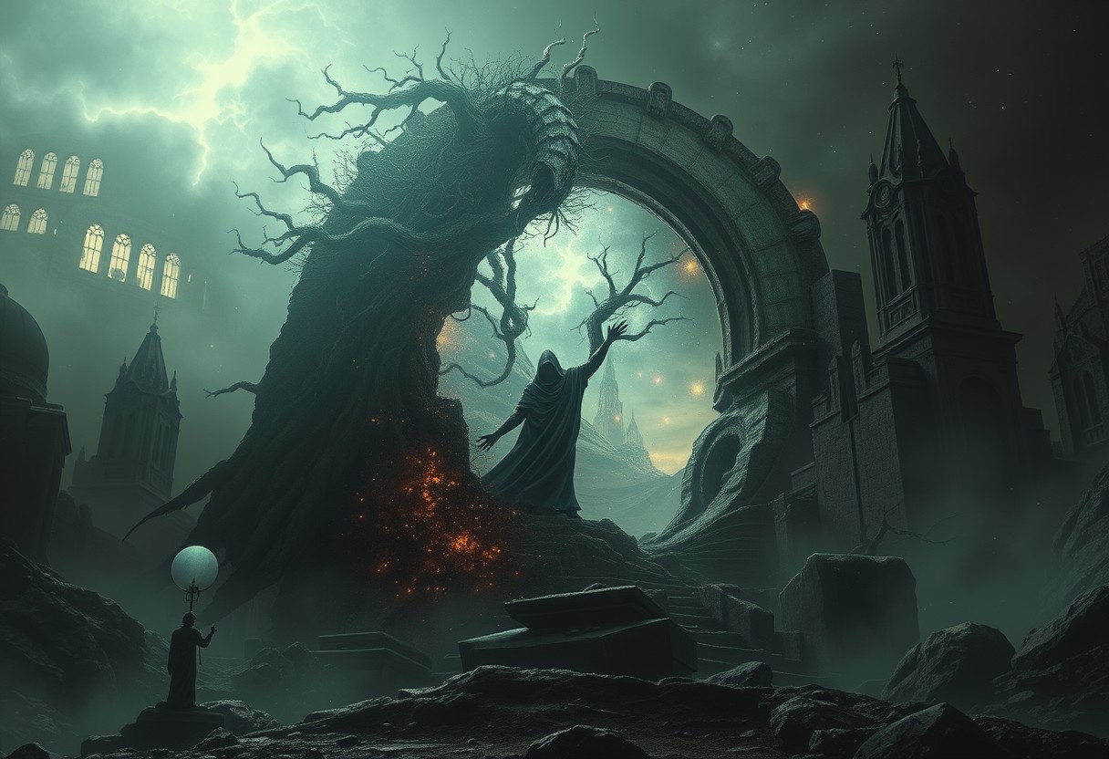 A universe inside a dark cloaked figure within mysterious landscape in an unfathomable realm of fantastic creation inhabited by ancient shadows of a forgotten time beyond the gate of the gateless gate where life is limitless, light is shadow and shadow is light, eerie sense, horror, spark of the beginning, existence and nonexistence at once, ethereal, outstretched arms, behold the end of the beginning, inglorious glory to the dark one, betrayal of the ancient order, beware the 7headed beast, destroyer of the old ways, bearer of the unbearable, nightmarish, archaic runes, tree aging backwards, breath of the gods, ruins of a place unimagined, extreme intricate detail, photorealistic, beyond epic scene, fate discarded, unseeable face of god, the end is the beginning, the beginning is the end, man arises as god dies, as above so below, as below so above, emerald tablet, thoth, guardian and saboteur of existence, hopeless hope, ghosts of the unborn, conception of the inconceivable, cosmic well of imperceptible perception, evil aura, infinite emptiness, pillars of void, overwhelming subtlety, abstract sacred geometry, beams of readiness without intention, gift of doom, despair of the ages, hidden secret warnings from dead gods, carved by the conductor of unholy loneliness of time incarnate, consumed by the night itself, beautiful tragedy of hellish discovery, unraveling mist of unreal reality