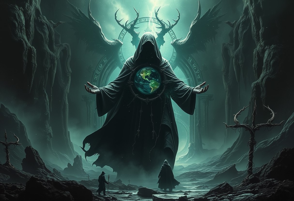 A universe inside a dark cloaked figure within mysterious landscape in an unfathomable realm of fantastic creation inhabited by ancient shadows of a forgotten time beyond the gate of the gateless gate where life is limitless, light is shadow and shadow is light, eerie sense, horror, spark of the beginning, existence and nonexistence at once, ethereal, outstretched arms, behold the end of the beginning, inglorious glory to the dark one, betrayal of the ancient order, beware the 7headed beast, destroyer of the old ways, bearer of the unbearable, nightmarish, archaic runes, tree aging backwards, breath of the gods, ruins of a place unimagined, extreme intricate detail, photorealistic, beyond epic scene, fate discarded, unseeable face of god, the end is the beginning, the beginning is the end, man arises as god dies, as above so below, as below so above, emerald tablet, thoth, guardian and saboteur of existence, hopeless hope, ghosts of the unborn, conception of the inconceivable, cosmic well of imperceptible perception, evil aura, infinite emptiness, pillars of void, overwhelming subtlety, abstract sacred geometry, beams of readiness without intention, gift of doom, despair of the ages, hidden secret warnings from dead gods, carved by the conductor of unholy loneliness of time incarnate, consumed by the night itself, beautiful tragedy of hellish discovery, release