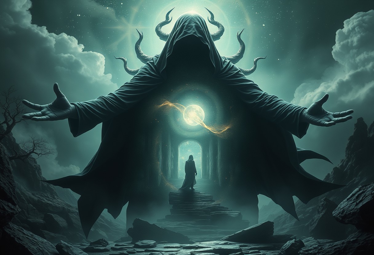 A universe inside a dark cloaked figure within mysterious landscape in an unfathomable realm of fantastic creation inhabited by ancient shadows of a forgotten time beyond the gate of the gateless gate where life is limitless, light is shadow and shadow is light, eerie sense, horror, spark of the beginning, existence and nonexistence at once, ethereal, outstretched arms, behold the end of the beginning, inglorious glory to the dark one, betrayal of the ancient order, beware the 7headed beast, destroyer of the old ways, bearer of the unbearable, nightmarish, archaic runes, tree aging backwards, breath of the gods, ruins of a place unimagined, extreme intricate detail, photorealistic, beyond epic scene, fate discarded, unseeable face of god, the end is the beginning, the beginning is the end, man arises as god dies, as above so below, as below so above, emerald tablet, thoth, guardian and saboteur of existence, hopeless hope, ghosts of the unborn, conception of the inconceivable, cosmic well of imperceptible perception, evil aura, infinite emptiness, pillars of void, overwhelming subtlety, abstract sacred geometry, beams of readiness without intention, gift of doom, despair of the ages, hidden secret warnings from dead gods, carved by the conductor of unholy loneliness of time incarnate, consumed by the night itself, beautiful tragedy of hellish discovery, release