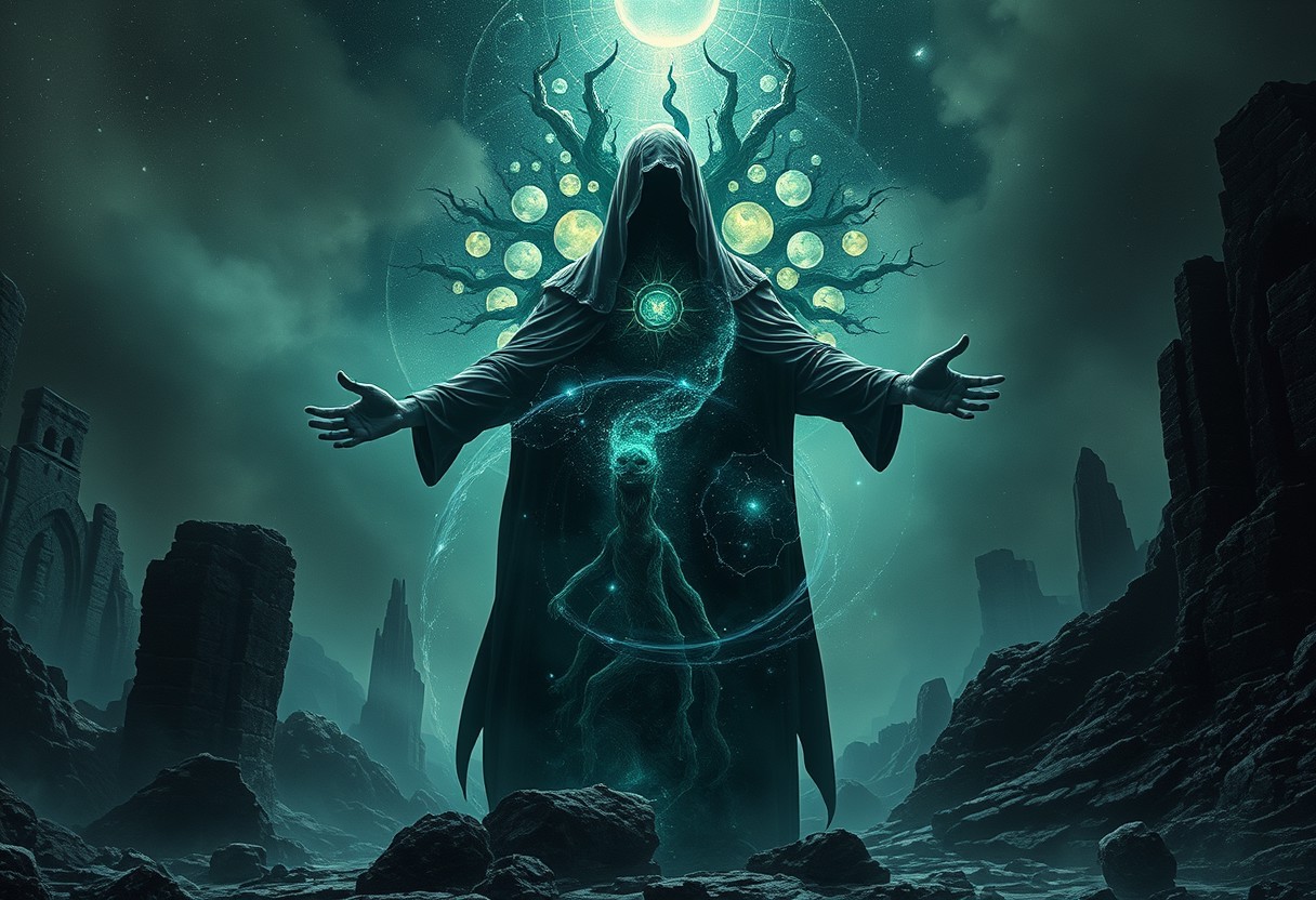 A universe inside a dark cloaked figure within mysterious landscape in an unfathomable realm of fantastic creation inhabited by ancient shadows of a forgotten time beyond the gate of the gateless gate where life is limitless, light is shadow and shadow is light, eerie sense, horror, spark of the beginning, existence and nonexistence at once, ethereal, outstretched arms, behold the end of the beginning, inglorious glory to the dark one, betrayal of the ancient order, beware the 7headed beast, destroyer of the old ways, bearer of the unbearable, nightmarish, archaic runes, tree aging backwards, breath of the gods, ruins of a place unimagined, extreme intricate detail, photorealistic, beyond epic scene, fate discarded, unseeable face of god, the end is the beginning, the beginning is the end, man arises as god dies, as above so below, as below so above, emerald tablet, thoth, guardian and saboteur of existence, hopeless hope, ghosts of the unborn, conception of the inconceivable, cosmic well of imperceptible perception, evil aura, infinite emptiness, pillars of void, overwhelming subtlety, abstract sacred geometry, beams of readiness without intention, gift of doom, despair of the ages, hidden secret warnings from dead gods, hand carved by the conductor of unholy loneliness with the sands of time incarnate, farewell her majesty