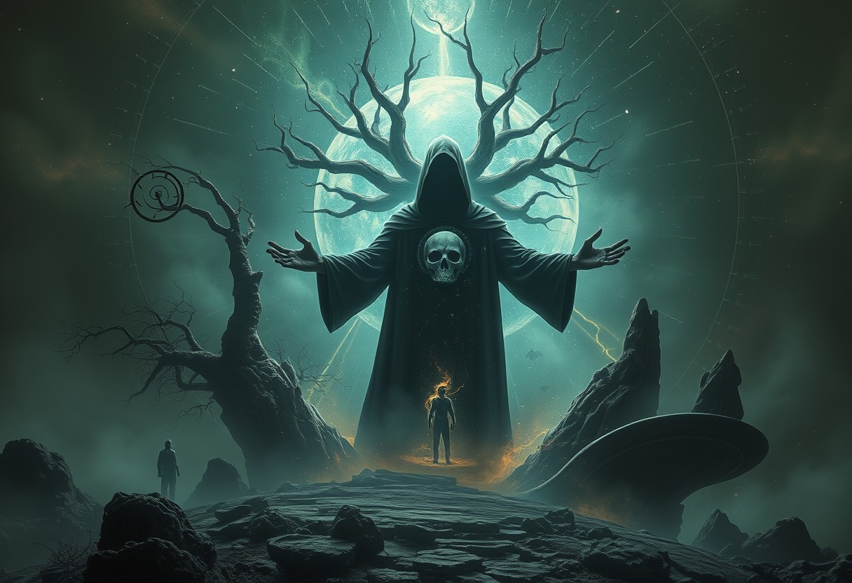 A universe inside a dark cloaked figure within mysterious landscape in an unfathomable realm of fantastic creation inhabited by ancient shadows of a forgotten time beyond the gate of the gateless gate where life is limitless, light is shadow and shadow is light, eerie sense, horror, spark of the beginning, existence and nonexistence at once, ethereal, outstretched arms, behold the end of the beginning, inglorious glory to the dark one, betrayal of the ancient order, beware the 7headed beast, destroyer of the old ways, bearer of the unbearable, nightmarish, archaic runes, tree aging backwards, breath of the gods, ruins of a place unimagined, extreme intricate detail, photorealistic, beyond epic scene, fate discarded, unseeable face of god, the end is the beginning, the beginning is the end, man arises as god dies, as above so below, as below so above, emerald tablet, thoth, guardian and saboteur of existence, hopeless hope, ghosts of the unborn, conception of the inconceivable, cosmic well of imperceptible perception, evil aura, infinite emptiness, pillars of void, overwhelming subtlety, abstract sacred geometry, beams of readiness without intention, gift of doom, despair of the ages, hidden secret warnings from dead gods, hand carved by the conductor of unholy loneliness with the sands of time incarnate, farewell her majesty