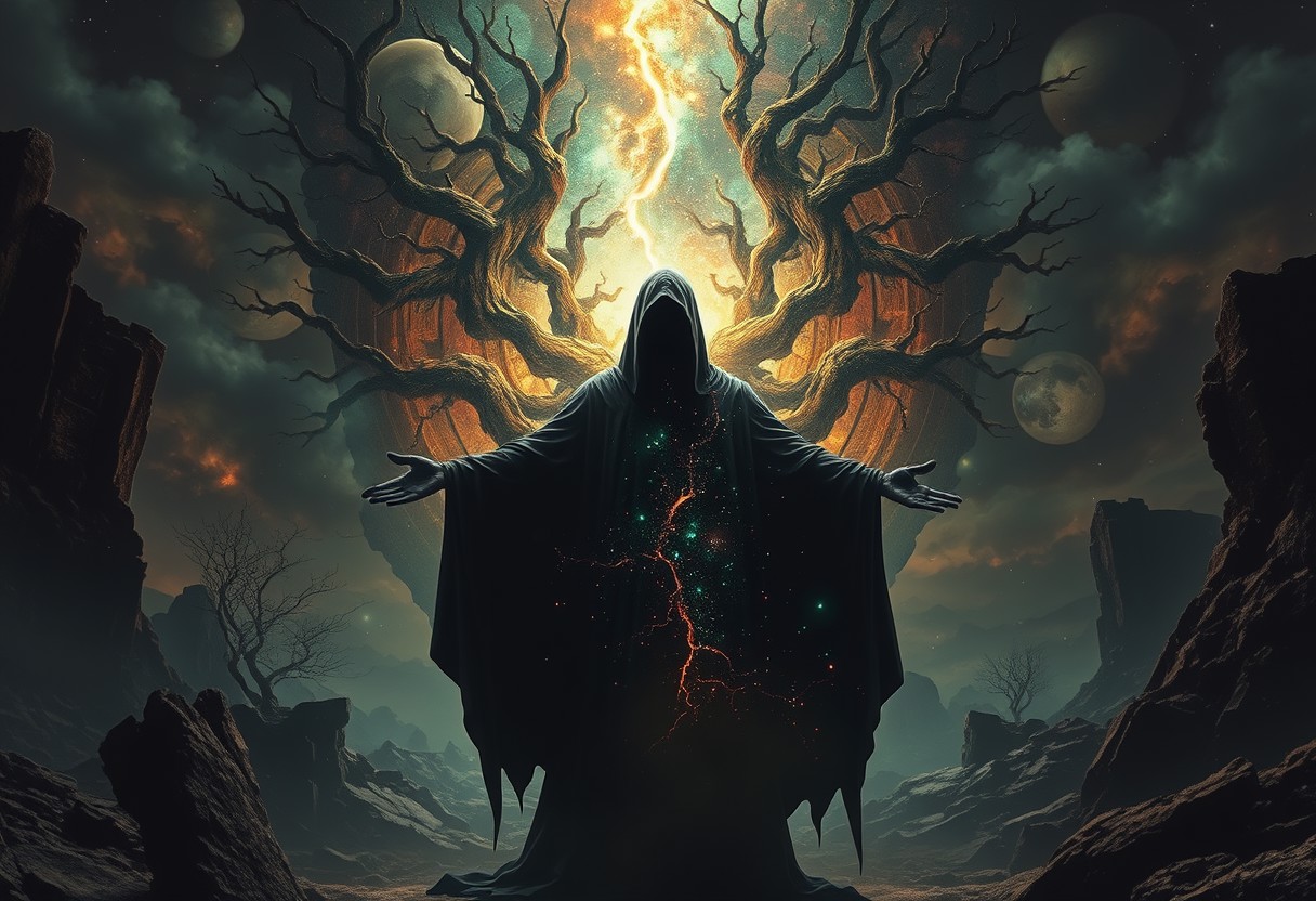 A universe inside a dark cloaked figure within mysterious landscape in an unfathomable realm of fantastic creation inhabited by ancient shadows of a forgotten time beyond the gate of the gateless gate where life is limitless, light is shadow and shadow is light, eerie sense, horror, spark of the beginning, existence and nonexistence at once, ethereal, outstretched arms, behold the end of the beginning, inglorious glory to the dark one, betrayal of the ancient order, beware the 7headed beast, destroyer of the old ways, bearer of the unbearable, nightmarish, archaic runes, tree aging backwards, breath of the gods, ruins of a place unimagined, extreme intricate detail, photorealistic, beyond epic scene, fate discarded, unseeable face of god, the end is the beginning, the beginning is the end, man arises as god dies, as above so below, as below so above, emerald tablet, thoth, guardian and saboteur of existence, hopeless hope, ghosts of the unborn, conception of the inconceivable, cosmic well of imperceptible perception, evil aura, infinite emptiness, pillars of void, overwhelming subtlety, abstract sacred geometry, beams of readiness without intention, gift of doom, despair of the ages, hidden secret warnings from dead gods, hand carved by the conductor of unholy loneliness with the sands of time incarnate