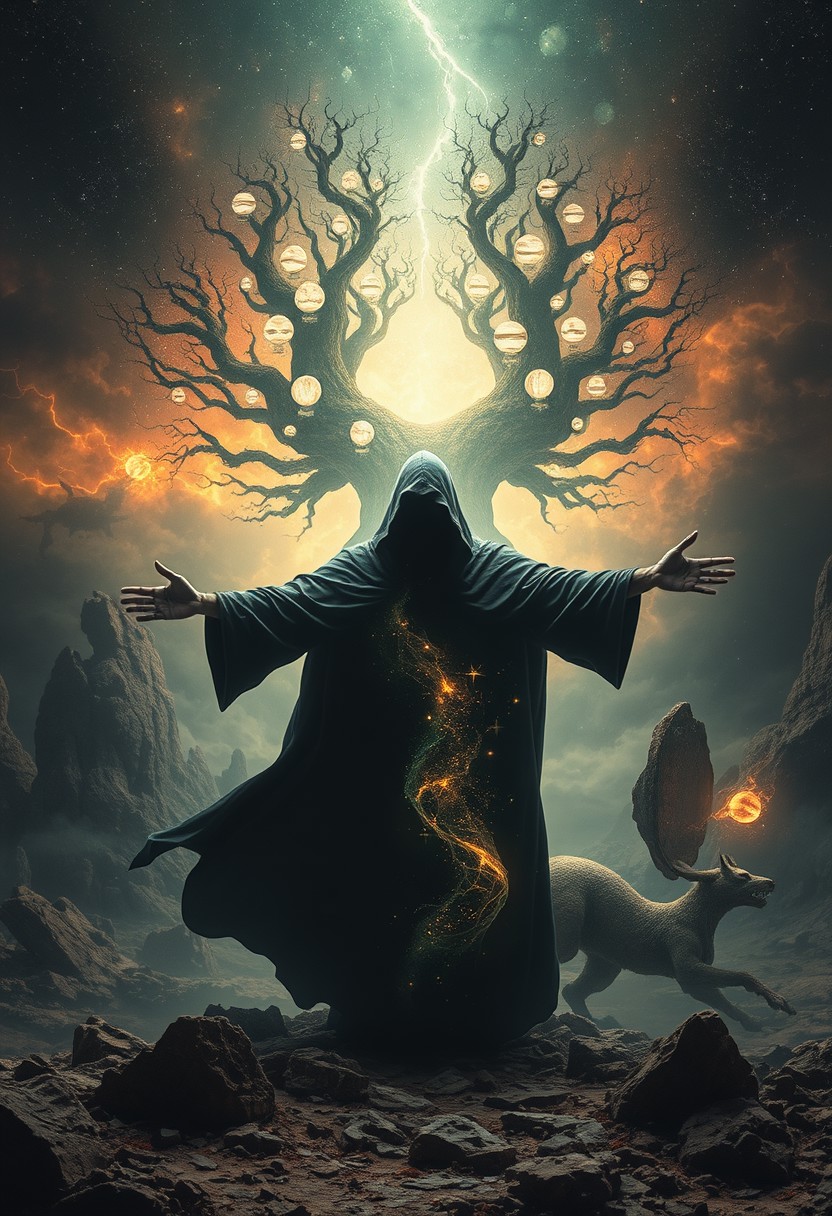 A universe inside a dark cloaked figure within mysterious landscape in an unfathomable realm of fantastic creation inhabited by ancient shadows of a forgotten time beyond the gate of the gateless gate where life is limitless, light is shadow and shadow is light, eerie sense, horror, spark of the beginning, existence and nonexistence at once, ethereal, outstretched arms, behold the end of the beginning, inglorious glory to the dark one, betrayal of the ancient order, beware the 7headed beast, destroyer of the old ways, bearer of the unbearable, nightmarish, archaic runes, tree aging backwards, breath of the gods, ruins of a place unimagined, extreme intricate detail, photorealistic, beyond epic scene, fate discarded, unseeable face of god, the end is the beginning, the beginning is the end, man arises as god dies, as above so below, as below so above, emerald tablet, thoth, guardian and saboteur of existence, hopeless hope, ghosts of the unborn, conception of the inconceivable, cosmic well of imperceptible perception