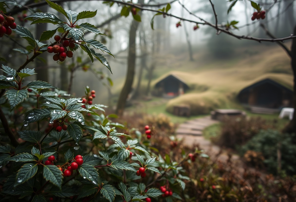In a forest, on a cold spring morning, deep within the fantastical neighborhood of Hobbiton, in the foreground focus are dewdrops on leaves of bushes, fog, berries, in the far off background beautiful hobbit holes