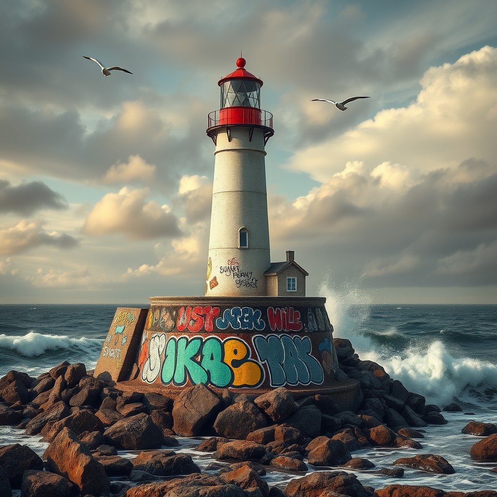 A picturesque lighthouse perched on a rocky coastline, its base covered in colorful graffiti. The artwork adds a modern twist to the historic structure. The background features crashing waves, a dramatic sky, and seabirds flying overhead, contrasting with the unexpected urban art.. [(contemporary street art:1.35) ::0.35], (Banksy and Pejac -inspired octane rendering with a dusty, simple touch), [Frank Cho and Kay Sage influence: artistic flair: 0.70], a contemporary street art piece inspired by Banksy's style rendered in octane, featuring a dusty and simple aesthetic, drawing artistic flair from the influences of Frank Cho and Kay Sage for a unique and captivating composition