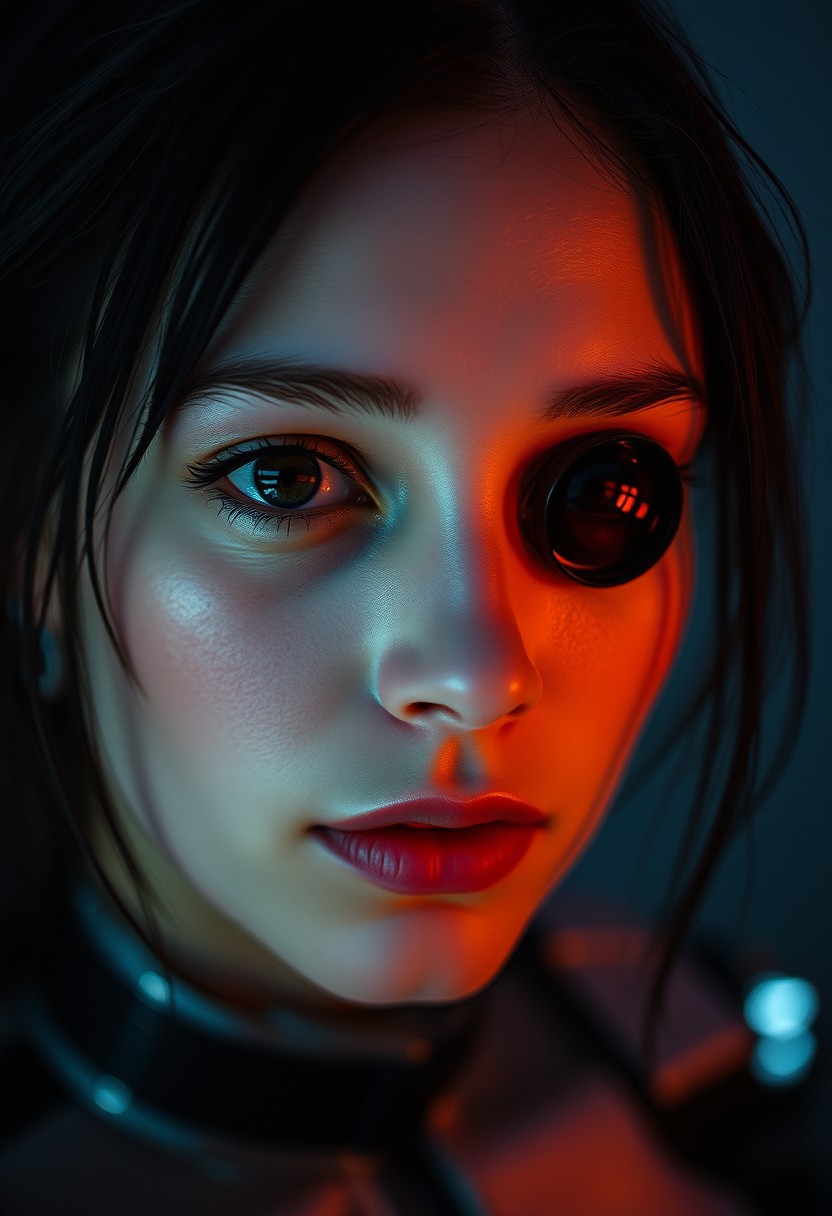 Yuri Shwedoff: A (cyborg:1.35 woman ) with (dark black void contact lens:1.5), created by Tony Conrad. The setting is Biopunk, featuring a shallow depth of field, vignette, (Fiber optic light painting), (Fujicolor Superia X-TRA 400:), (Light tracing), and (Dramatic lighting).