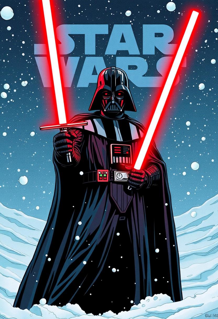 score_9, score_8_up, score_7_up, great quality, high res, uncensored, BREAK Darth Vader in a snowy environment, he is holding a red glowing lightsaber, looking at the viewer menacingly, solo, vintage comic book style,