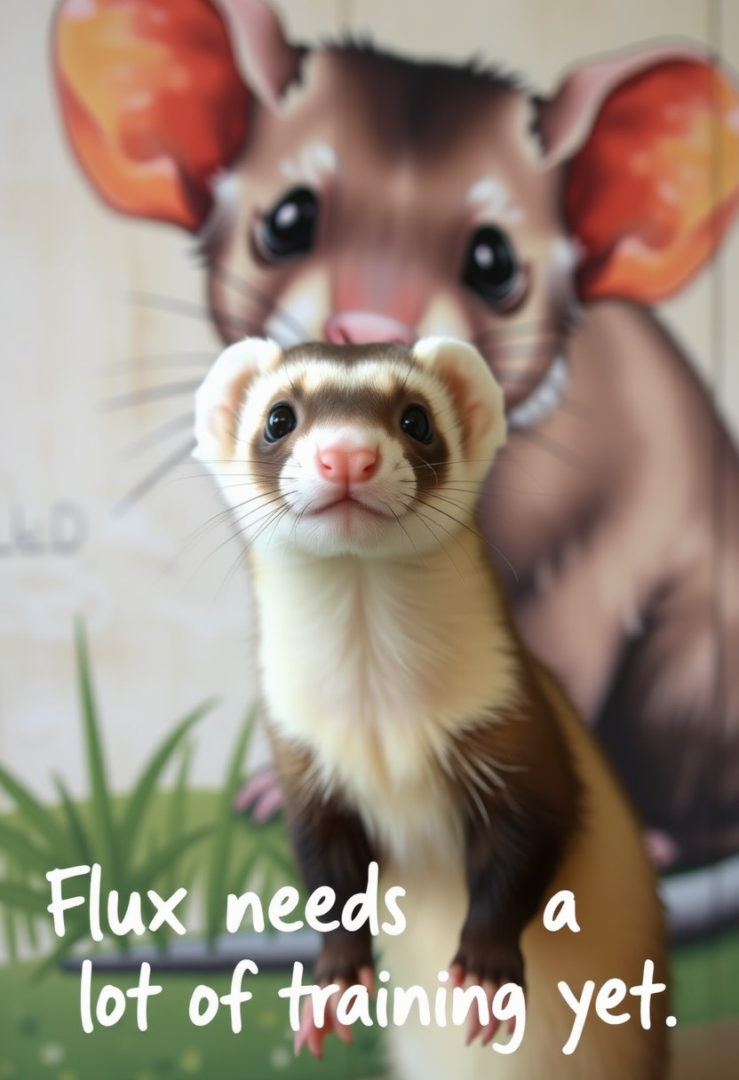 a ferret in front of a mural of a mouse with the text "Flux needs a lot of training yet" in a handwriting font