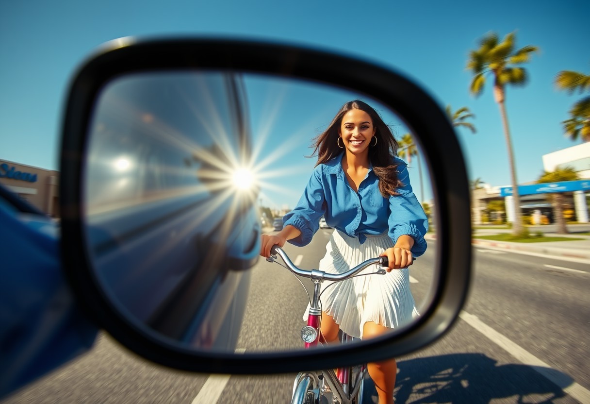 photograph of A smiling beautiful woman dressed in a blue oversized shirt and a white pleated skirt, riding a bicycle, looking at her own reflection in car wing mirror, close up, wide angle, The scene is set on a sunny day with clear blue skies, showcasing an urban street environment with cars and palm trees in the background. The image exhibits a light flare and is partially framed through a circular object, adding a unique visual effect to the composition. The overall mood is carefree and joyful, capturing a casual and stylish moment.