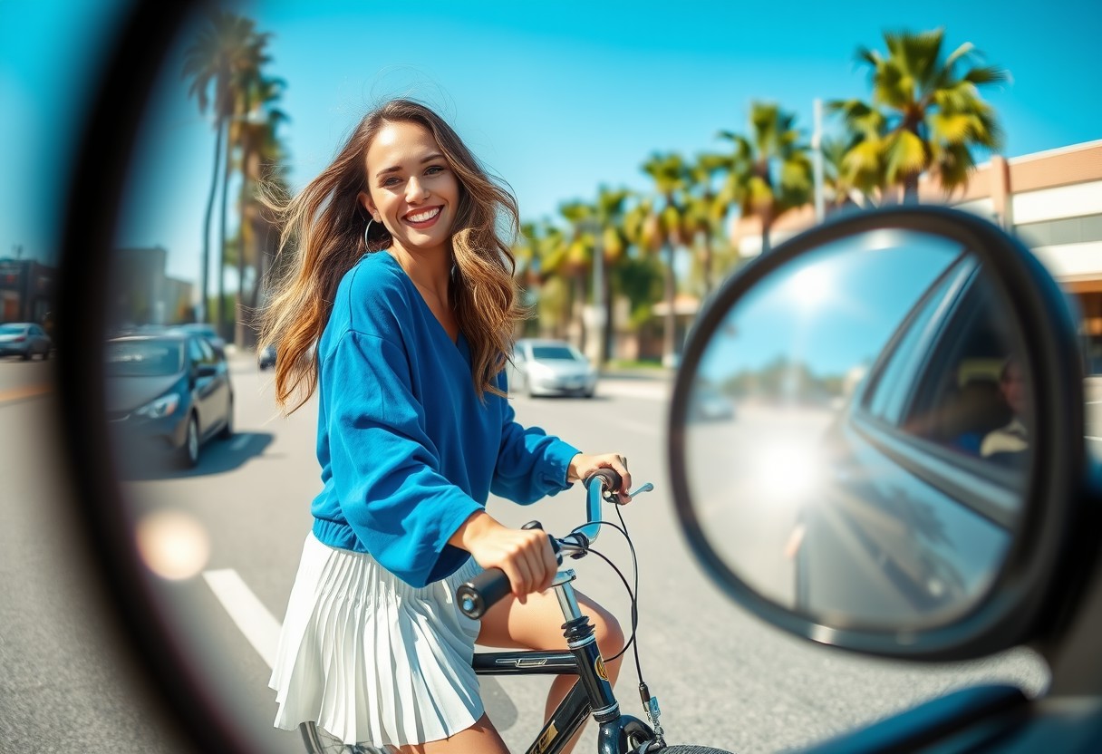 photograph of A smiling beautiful woman dressed in a blue oversized shirt and a white pleated skirt, riding a bicycle, looking at her own reflection in car wing mirror, close up, wide angle, The scene is set on a sunny day with clear blue skies, showcasing an urban street environment with cars and palm trees in the background. The image exhibits a light flare and is partially framed through a circular object, adding a unique visual effect to the composition. The overall mood is carefree and joyful, capturing a casual and stylish moment.