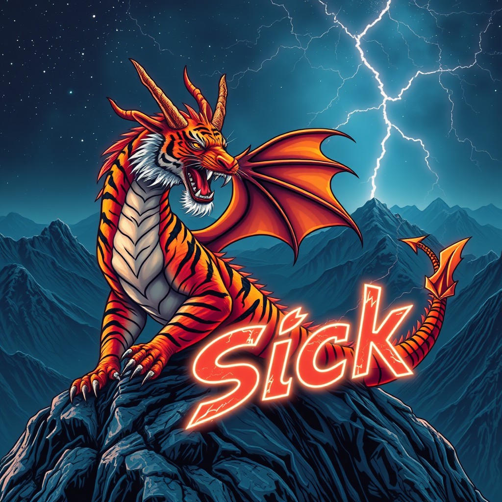 A tiger-striped dragon sitting on a mountain-top. Orange and black stripes. Two horns. Dragon Wings. Roaring. Breathing fire. Background mountains at night. Cosmic skyscape. Synthwave colorscheme. Very realistic, fantasy illustration. with the phrase "Sick" emblazoned in 3D, intricate, lightning patterns, with a predominantly neon colors,