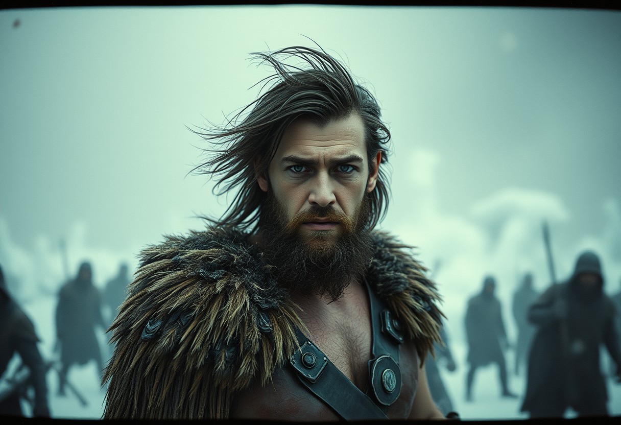 upper body closeup shot, old grainy analog photo, bad image quality, heavy film grain, monochrome with low key color spots, Create an action scene featuring a barbarian in a apocalyptic battlefield , standing in the midst of an ice forest. He is calm and cool. His hair adding to the dramatic effect. The scene is vibrant with atmospheric lighting and cinematic composition.