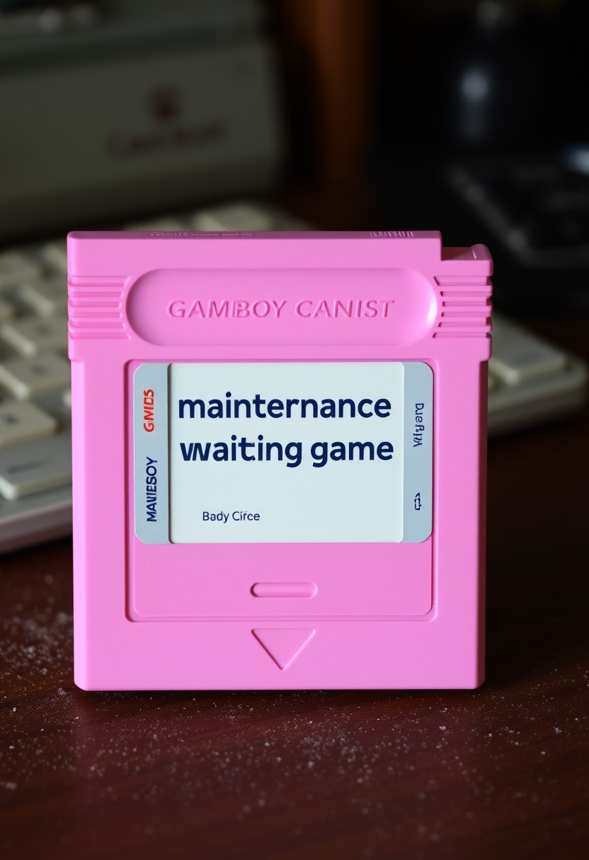 A pink gameboy cartridge that says "maintenance the waiting game" background is a wooden desk with dust