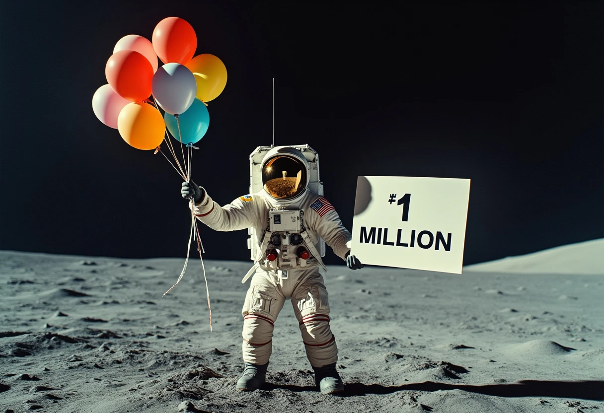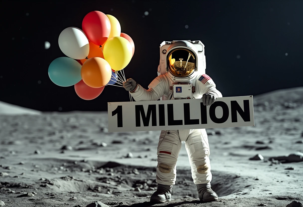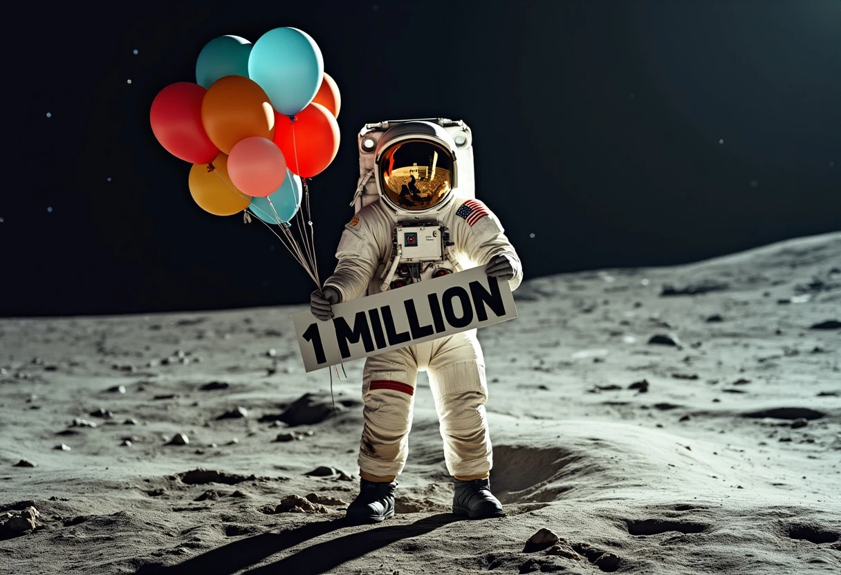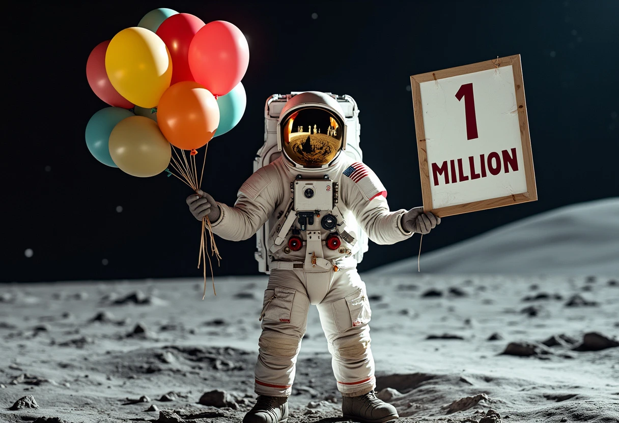 A highly realistic photo of an Apollo 11 astronaut standing on the lunar surface. The astronaut is holding a bunch of colorful helium balloons in one hand and a large sign in the other that reads '1 MILLION' in bold letters. The background features the iconic lunar landscape with the gray, dusty surface and the black sky of space. The astronaut's suit is detailed and accurate to the 1969 mission, with clear reflections on the visor. The image has a cinematic quality, with sharp focus and high definition, capturing the surreal moment.