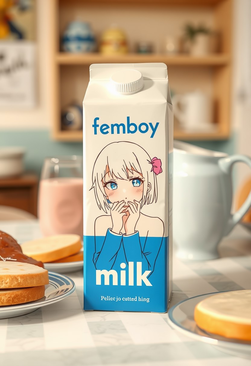 a milk box on a breakfast table. The milk is titled "femboy milk" with a anime girl character bitting her lips