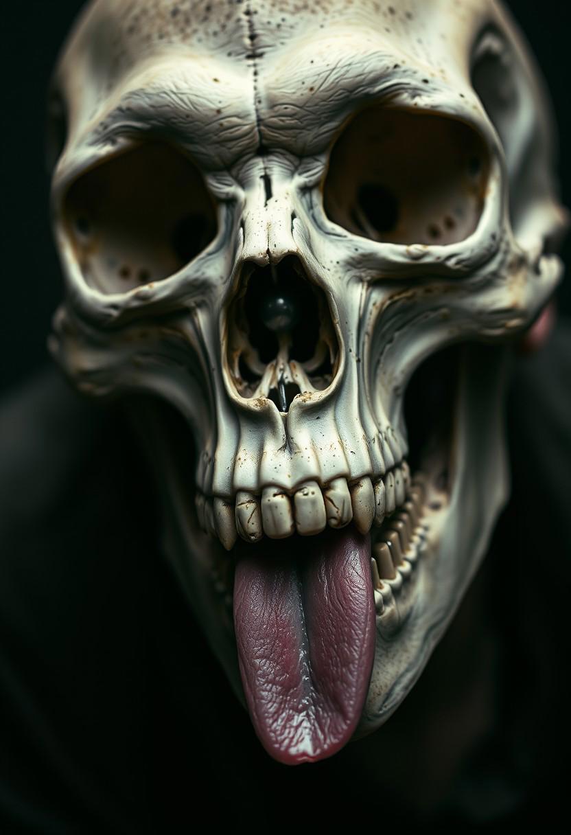 Skull tongue piercing, moody, candid, natural pose, realistic, photorealistic, HD, extremely detailed, dynamic scene, dof, cinematic shot, 35mm, film grain