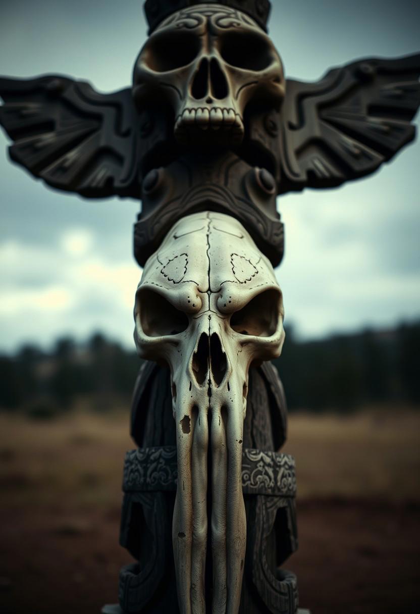 Skull totem pole, moody, candid, natural pose, realistic, photorealistic, HD, extremely detailed, dynamic scene, dof, cinematic shot, 35mm, film grain