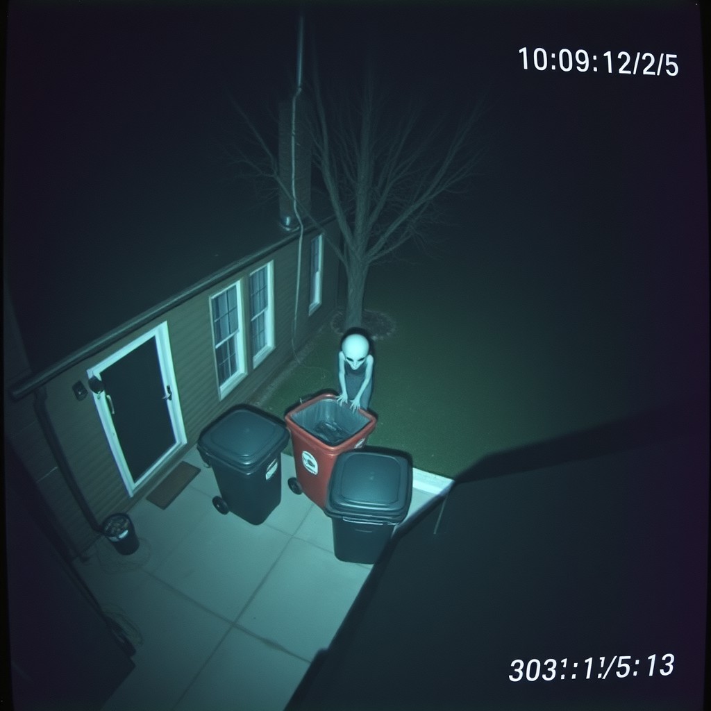 a frame from a night security camera captures an alien lost in the night hidden, hiding by the trashcans in the backyard of a house watching the street, the camera is positioned on a roof so the view is from above, night vision, poor quality cctv, in the image you can see the date and time, film grain