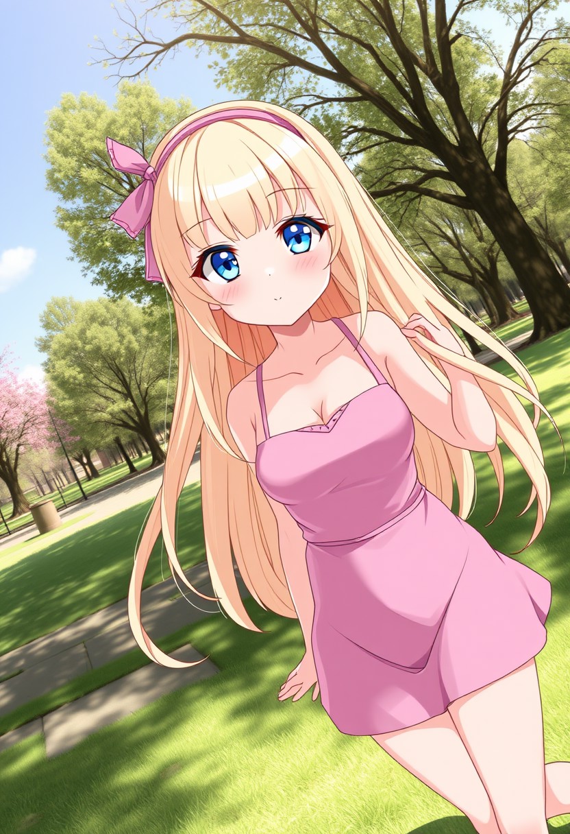 score_9, score_8_up, score_7_up, score_6_up, rating_questionable, 1girl, cute, long blonde hair, parted bangs, pink hairband, blue eyes, gorgeous lips, medium breasts, slender, large hips, beauty spots, light makeup, dynamic pose, posing, wearing short pink sundress, cleavage, v-slot, hearts pattern dress, walking, park, sunny, shadows, trees
