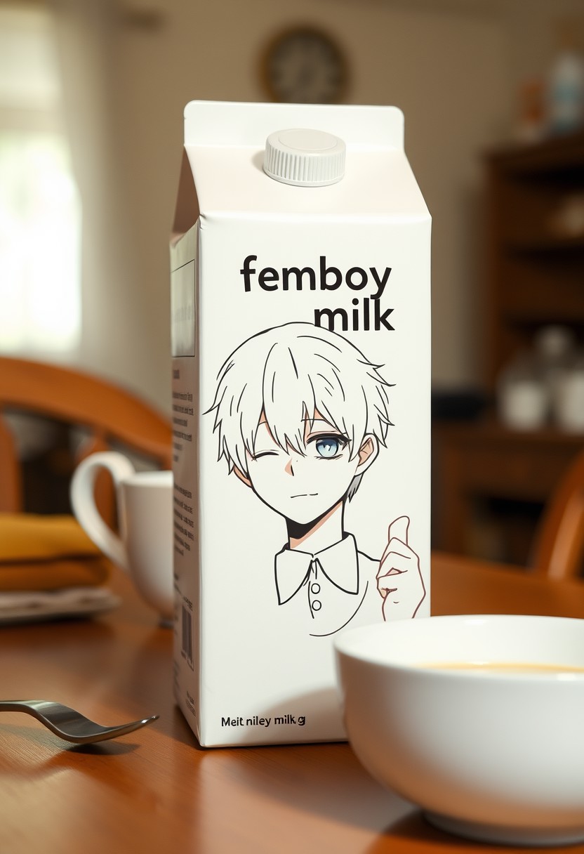a milk box on a breakfast table. The milk is titled "femboy milk" with a anime girly guy character blinking his eye