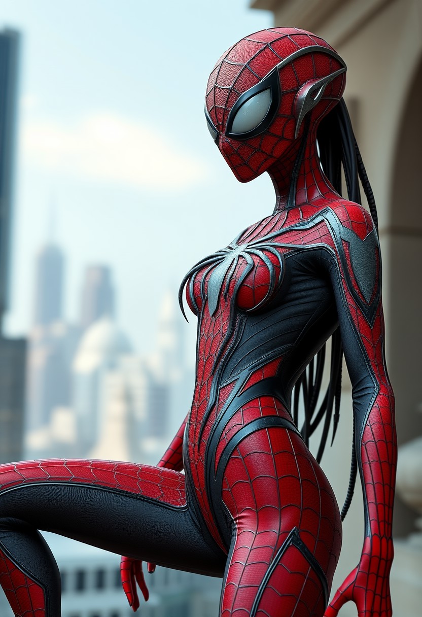 18yo alien spiderwoman supermodel female in skin tight Spiderman like outfit - so intricate detailed and thin that it seems painted on and accentuates her slender prefect supermodel body and huge gigantic sagging natural hangin hyper large breasts, wide angle full body image)