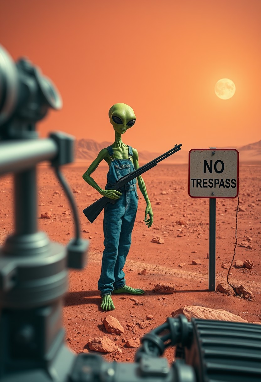 photograph of an alien on mars taken by a NASA mars rover. blurry rover robotic arm in the foreground In the middle of the image, a green alien stands a few meters from the rover, he wears a blue jeans overall and holds a pump action shotgun. The alien looks angry. Next to the alien is a sign that reads "NO TRESPASS". The scene takes place on the surface of Mars, the ground is made of red rocks and sand, red mountains can be seen in the distance. The sky is red and dusty. The sun appears small and weak in the sky. The landscape is empty and desolate. 18mm, wide angle camera, jpg artefacts,