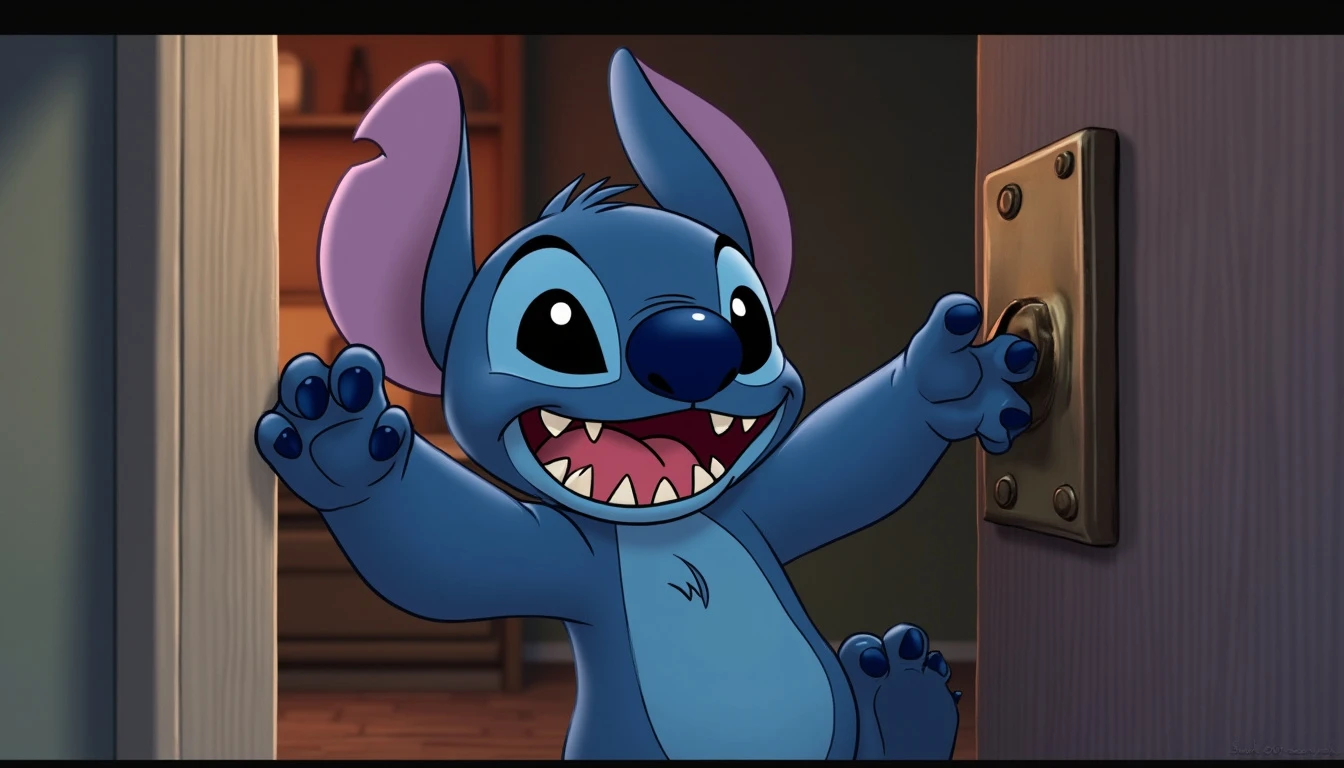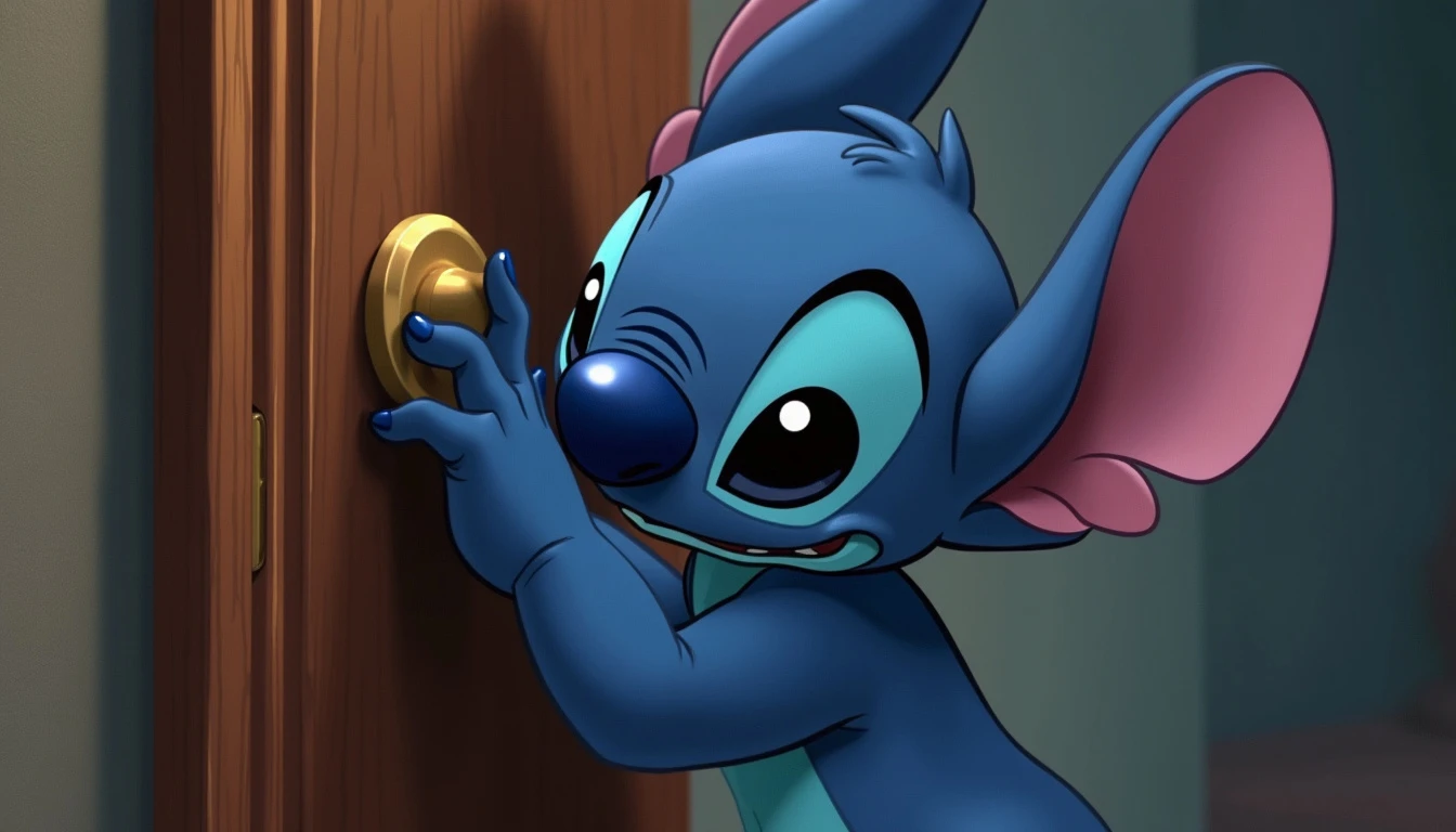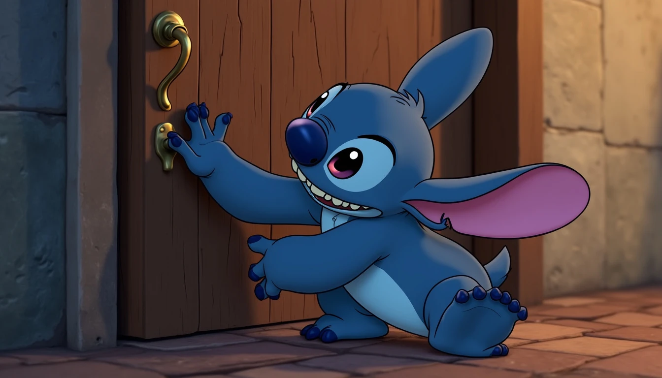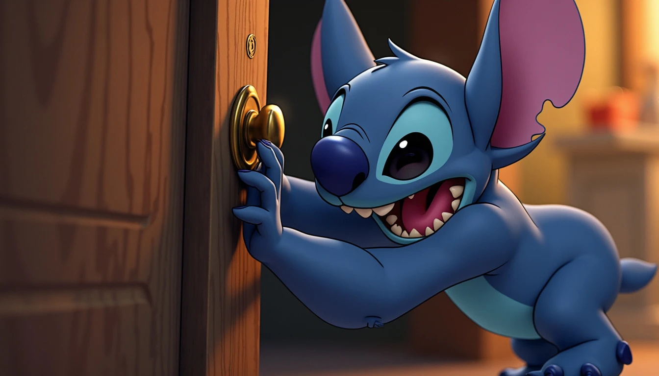 Stich disney character close up just on his hand knocking on a door , photo of his hand only knocking on an entrance door , just hand close up frame