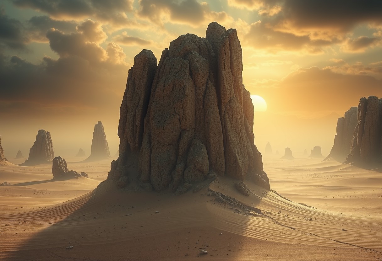 stelar apocalyptic landscape, top hard light, sand environment, mystic, highly detailed, melancholic, masterful photography, ultra detailed