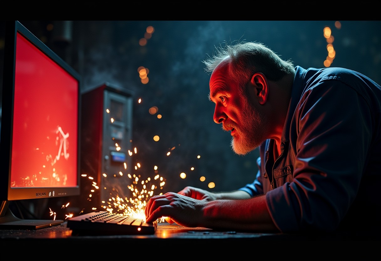 Closeup from below, Cinematic atmosphere, Dark sci-fi movie scene, arthouse film, night, nighttime, dark shadows, in spaceship serverroom, old tanned hairy musclechub grandpa strongman, big belly, hairy shoulders, wearing a blue leather overall, shocked and surprised expression, in a workshop while repairing a computer with mechanics tools, many sparks flying, electric currents, lightning, computer exploding, server error, computer errors, red screen, sparks coming out of monitor, demonic, occult, dark smoke, closeup, dynamic camera angle, dynamic perspective, closeup from above, explosion, hyperspace, warp speed, dimensional shift