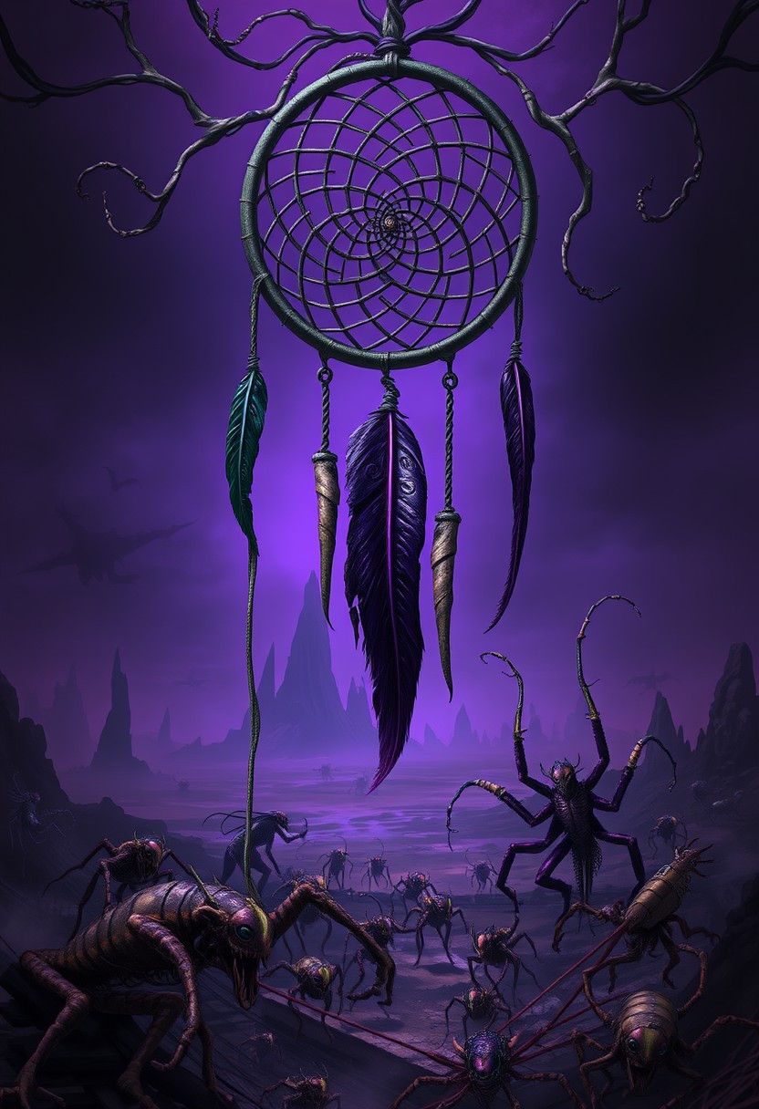 In a shadowed realm, a dreamcatcher hangs, its web a lattice of sinew, metal, and dark threads. Muted purples form the base, intertwined with sickly greens and deep blues, casting an otherworldly glow. The web's tendrils twist like veins, pulsing with energy. Feathers, crafted from bone and metallic fibers, hang from the dreamcatcher, shifting between dark violet and emerald green. The ring is a fusion of twisted, biomechanical forms—organic matter melded with cold steel, etched with cryptic symbols. Behind it, the landscape is a surreal expanse, jagged spires rising like bones. Shadowy tendrils, part flesh, part machine, snake through the air. Purple hues dominate, flashes of green and blue adding to the dreamlike atmosphere. The midground teems with grotesque creatures, horrific blends of organic and mechanical elements. Some have insect-like limbs, exoskeletons a patchwork of rusted metal and decaying flesh. Others slither through the air, serpentine, segmented, with exposed gears and sinew, eyes replaced by glowing, mechanical orbs. A few crawl on twisted, spider-like appendages, bodies armored with bone and steel. The air around the dreamcatcher is thick with foreboding, as though the object itself is sentient, feeding on nightmares it captures. The blend of colors and biomechanical forms blurs the line between reality and nightmare.