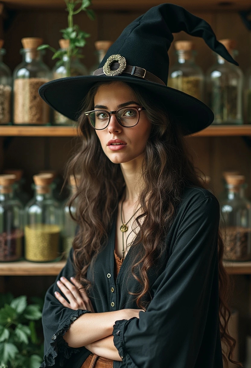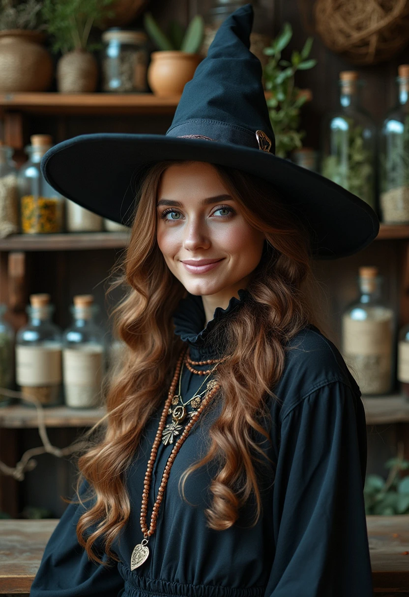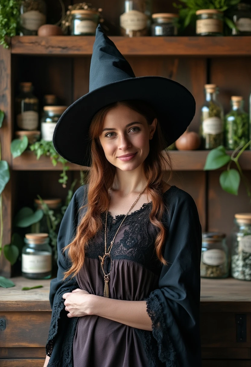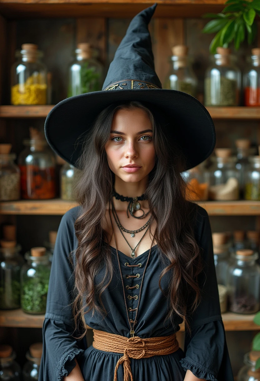 photo of a witch with a wooden shelf full of jars with herbs and potion ingredients in the background, digital photography, high quality, 8k, 4k