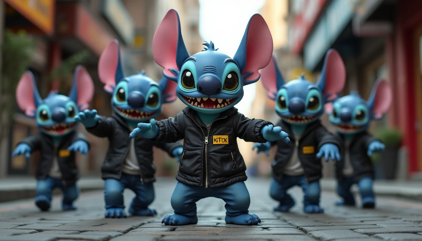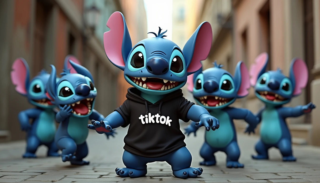 STITCH 3D charcater urban street photography TIKTOK logo on his black clothes , having 5 more Stitch friends dancing along