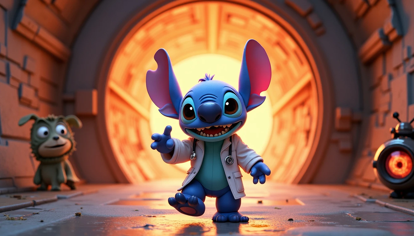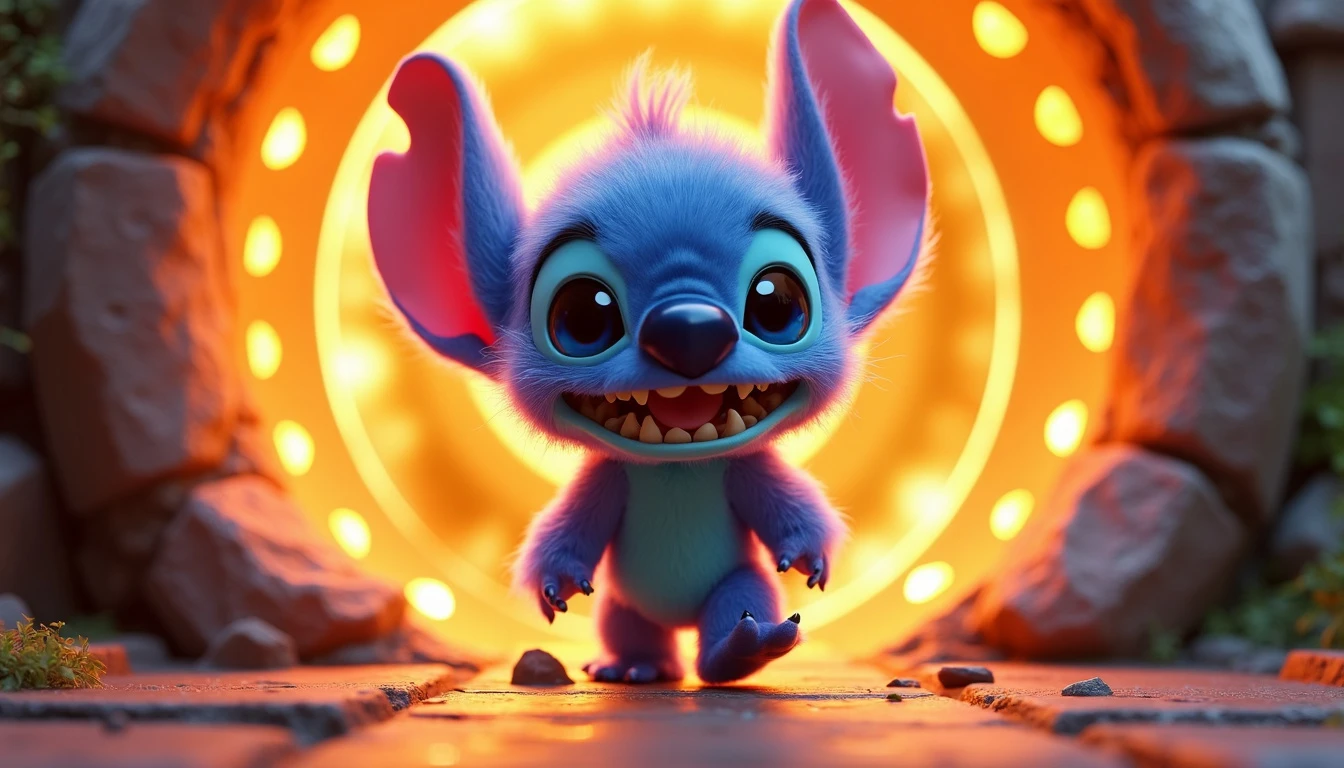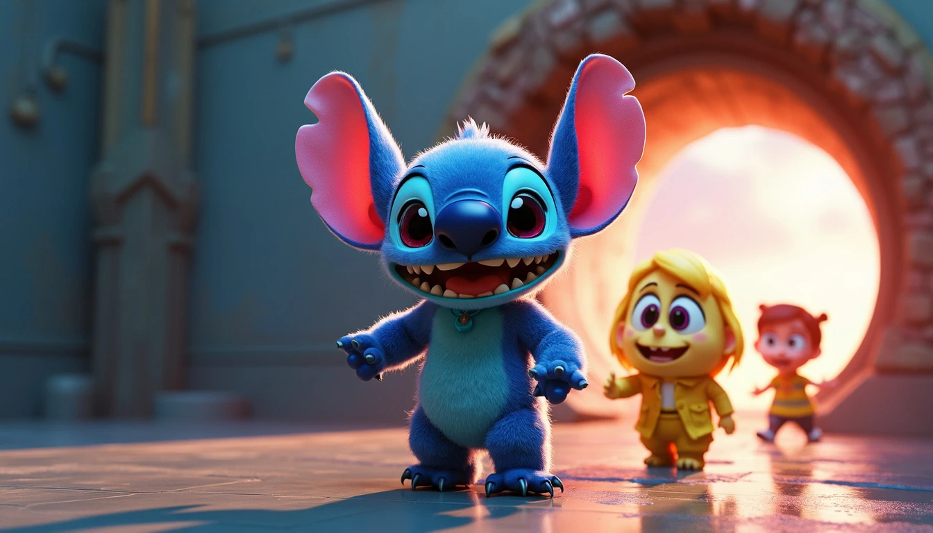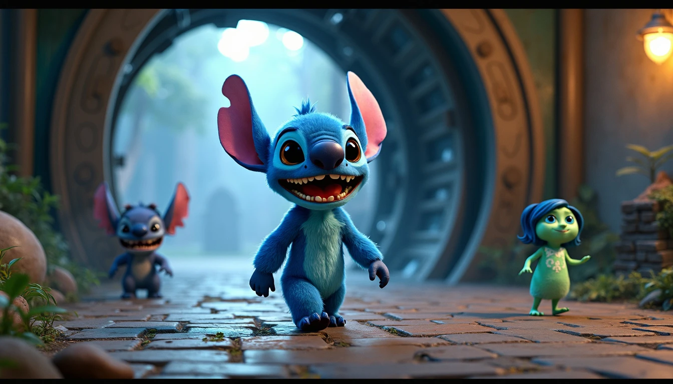 2025 fluffy 3d Stitch Walking out of a portal like DR Stange but accompanied by Inside Out 2 characters