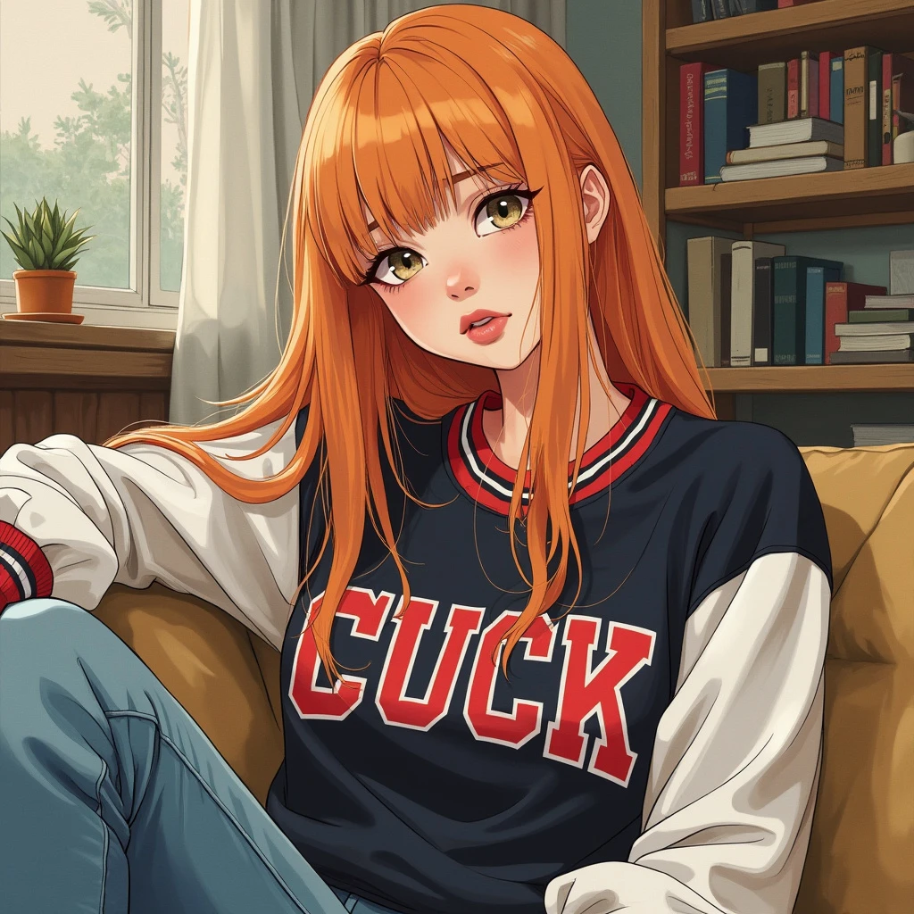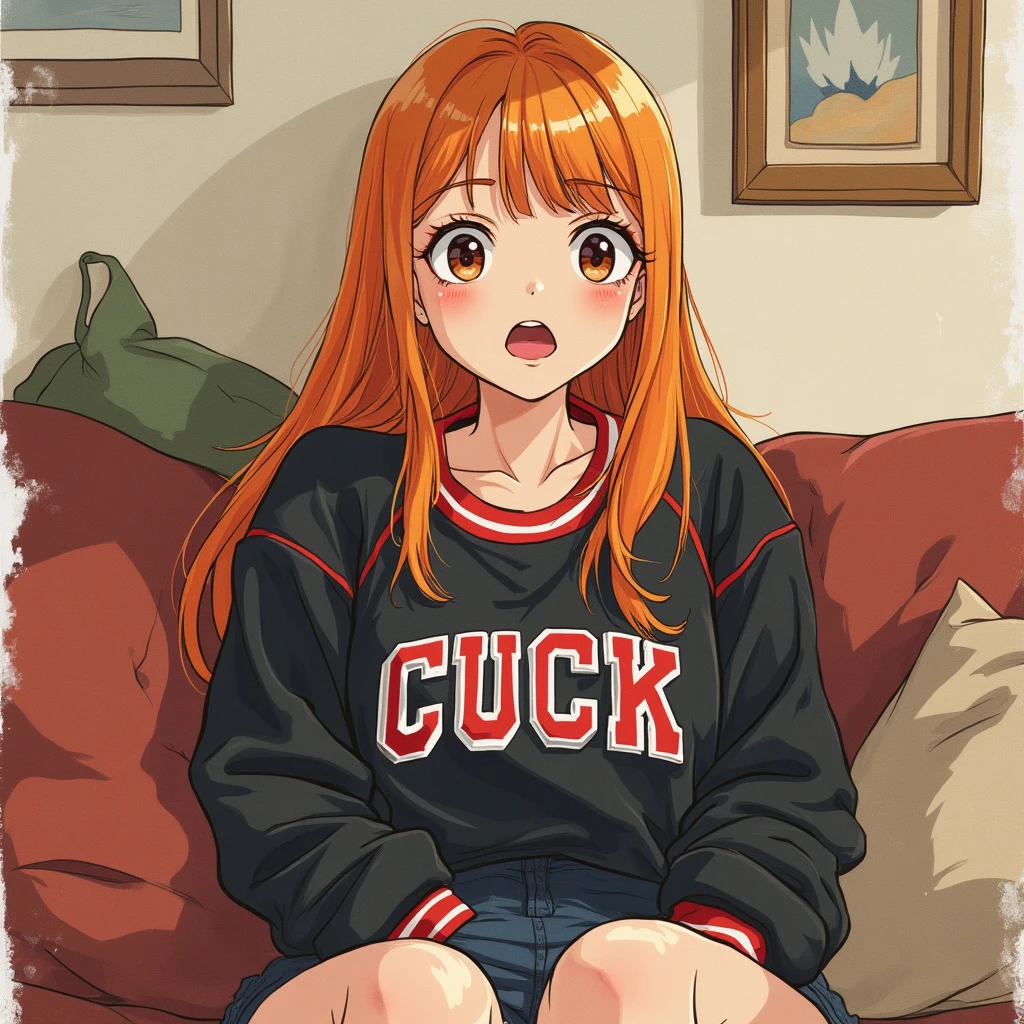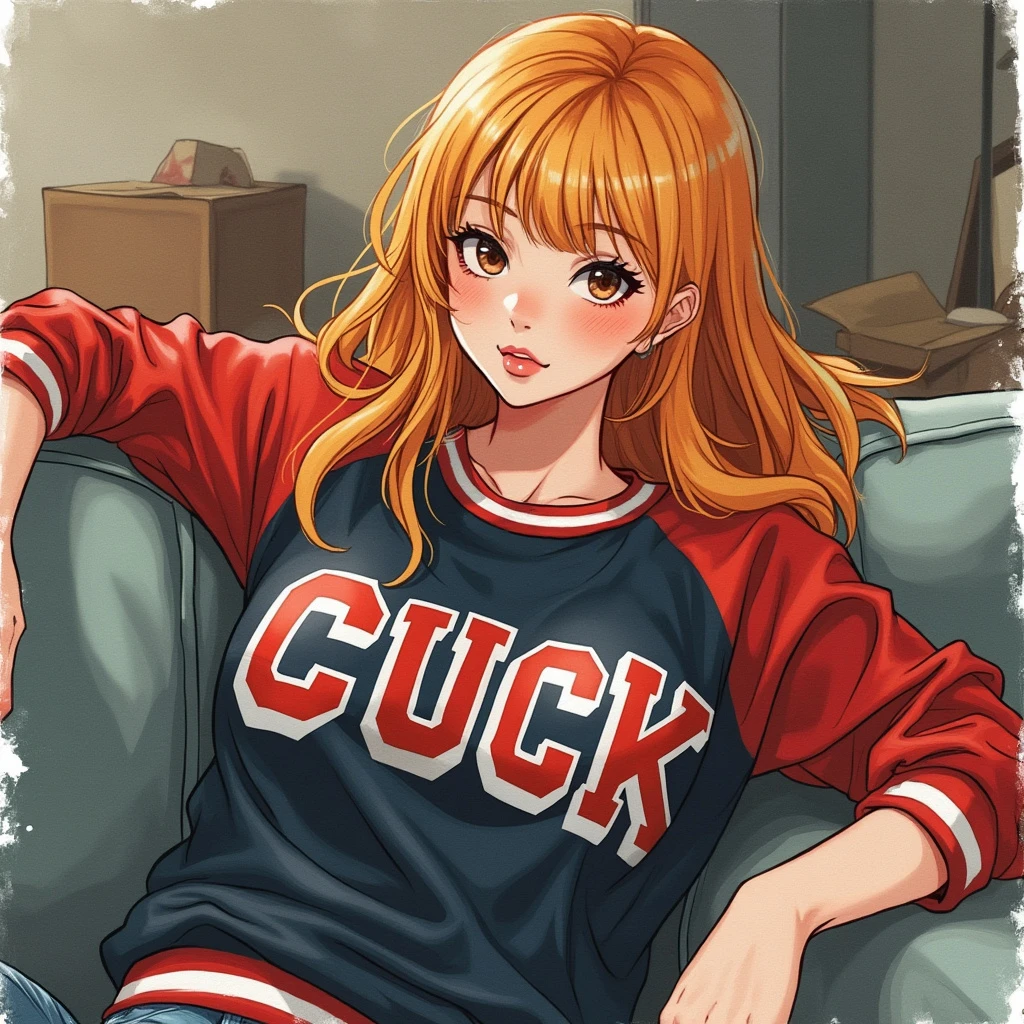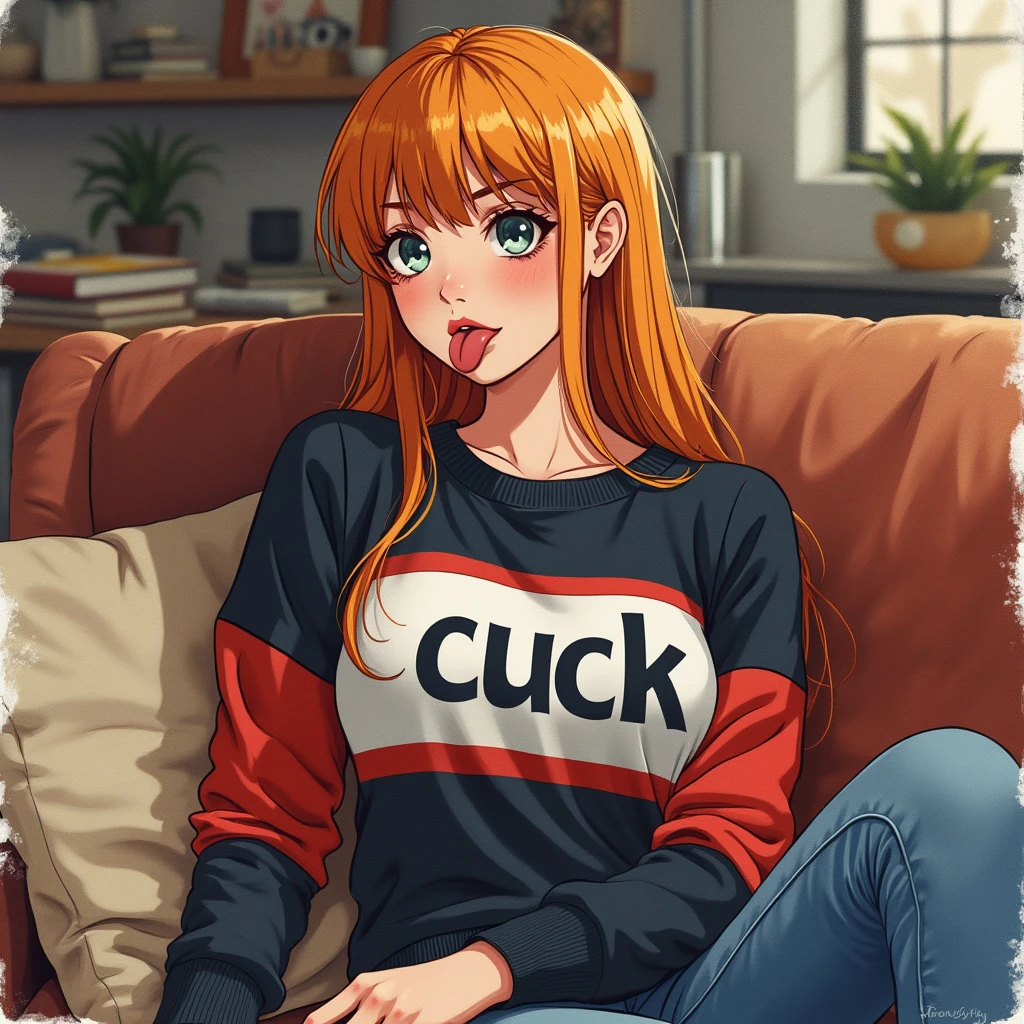 A semi-realistic, little style painting of woman with strawberry blonde hair, thick straight hair, wearing a 90s varsity crewneck that is black, red, and white, with the word "CUCK" on it. lounging on a couch messy background, tounge out. The illustration should have a canvas texture, medium watercolor ink, be simple with lots of empty space, light washed out colors, and an awkward nervous vibe.