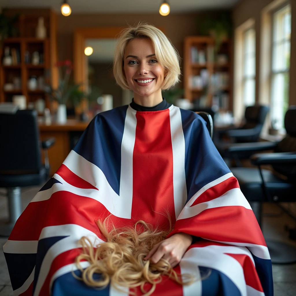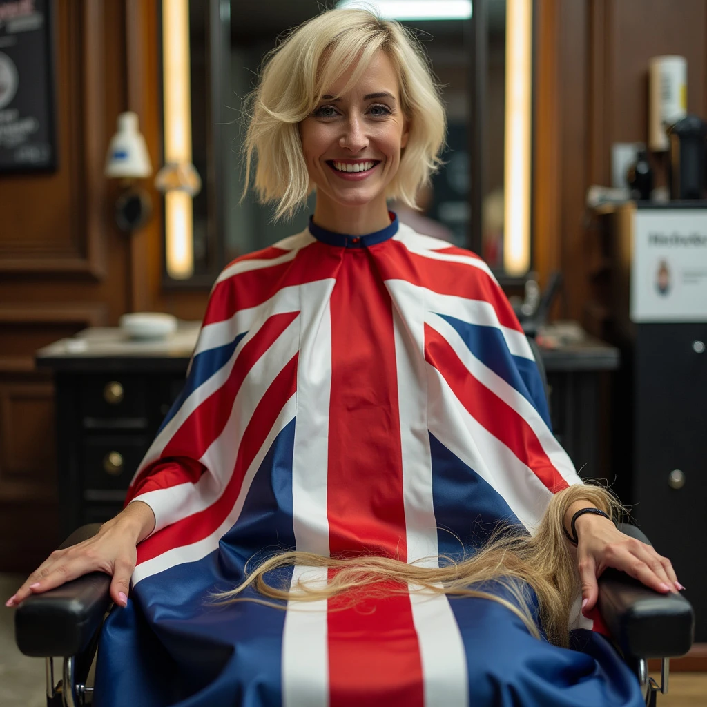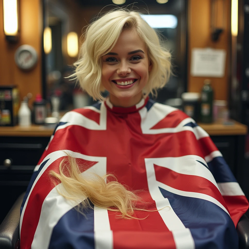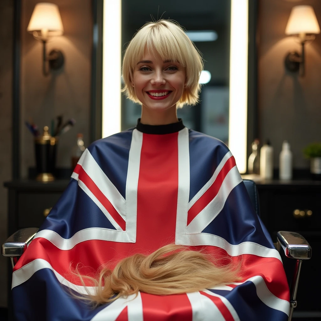 First Person view, happy Short hair Woman in a barber chair in Front of a mirror, wearing a very large british flag satin barber cape. A Lot of cut off blonde hair is lying on the cape.