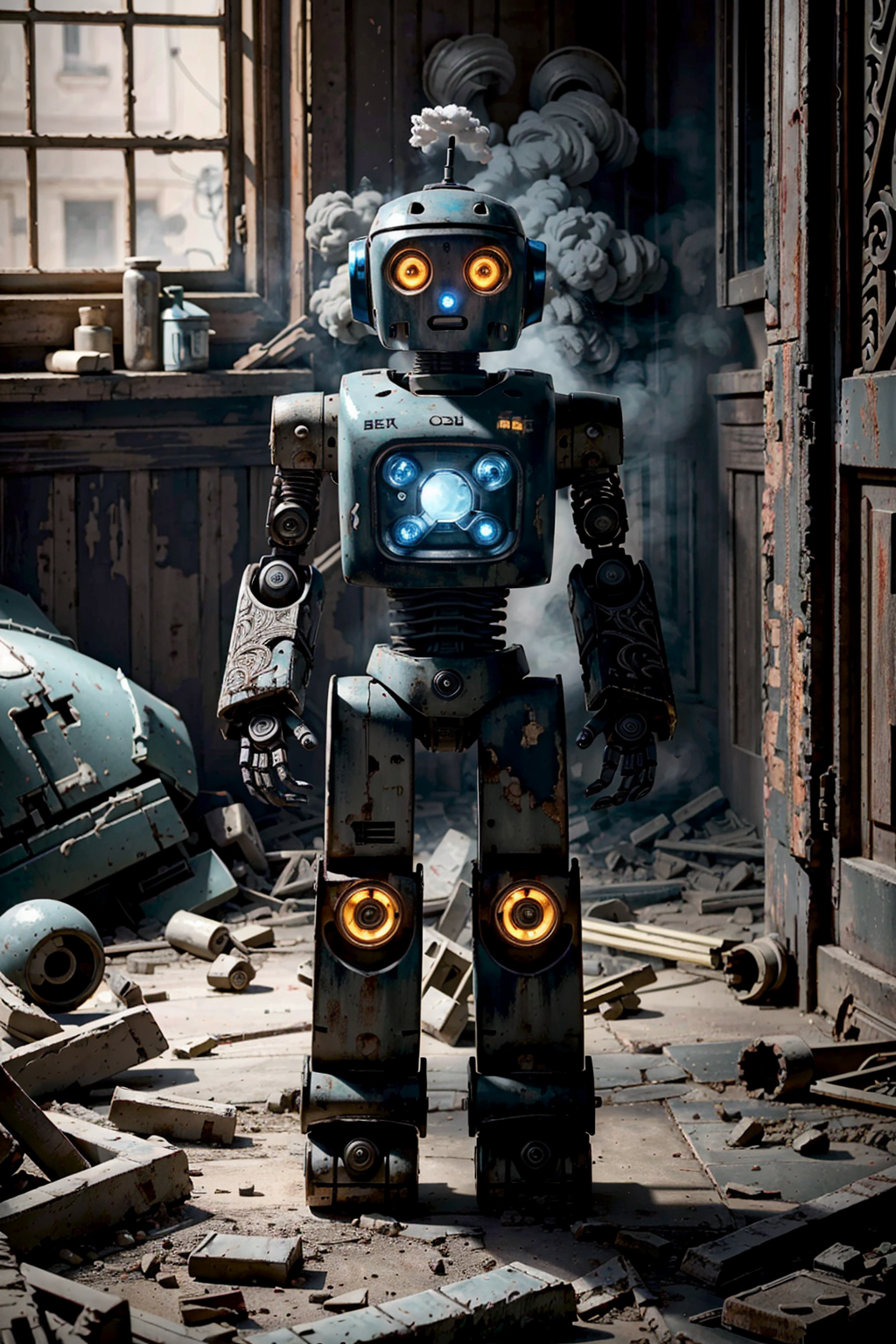 (Best quality:1.5), (intricate details:1.5), (realistic), (more detail), (A robot gone berserk:1.2), (A profound feeling), (Destroyed room:1.2), Destroying, Ancient place, gear, steam, Tools, <lora:detail_slider_v4:1.0>,