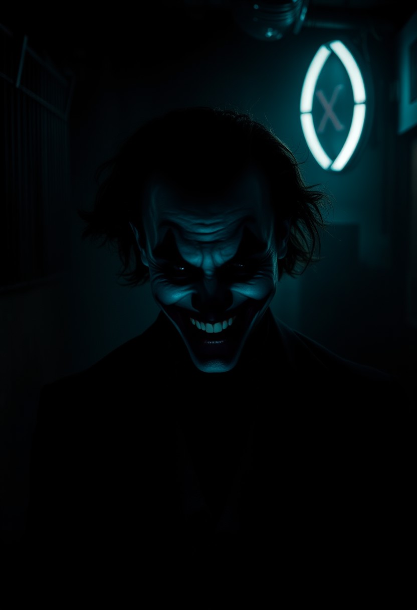 a haunting and mysterious portrayal of the Joker in a dimly lit, shadowy environment. The Joker stands alone, surrounded by an atmosphere of eerie darkness, with subtle hints of neon lights casting surreal highlights on his iconic face. Capture the enigmatic smile and madness in the Joker's expression, emphasizing the chaos that defines his character. Utilize dramatic lighting to create deep shadows and highlights, adding a sense of theatricality to the scene. The background should be atmospheric, with elements that suggest a gritty, urban setting. Emphasize the psychological depth and complexity of the Joker's character in this captivating, dark composition