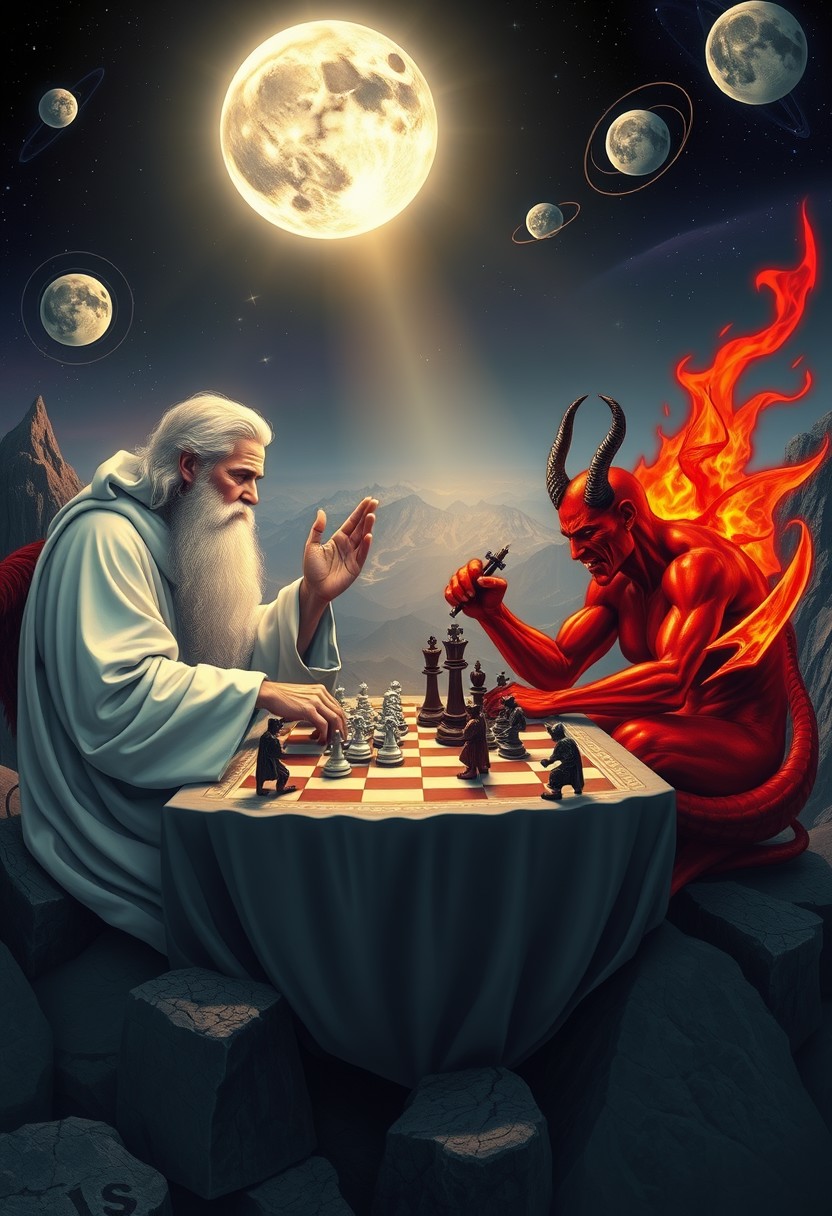 god and the devil are playing chess, they are sitting at a table in a mountain top with celestial bodies, or a cosmic backdrop, god is despicted as a wise old man in white robes and a long beard, the devil is red with horns , the chess pieces are little humans, they both look very concentrated and looking at chessboard, divine light surrounding God, hellfire glow around the Devil
