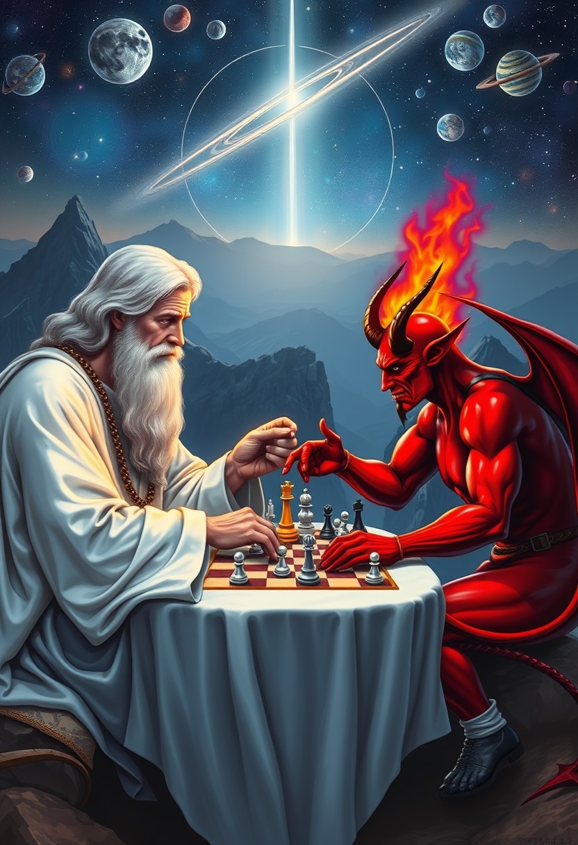god and the devil are playing chess, they are sitting at a table in a mountain top with celestial bodies, or a cosmic backdrop, god is despicted as a wise old man in white robes and a long beard, the devil is red with horns , the chess pieces are little humans, they both look very concentrated and looking at chessboard, divine light surrounding God, hellfire glow around the Devil