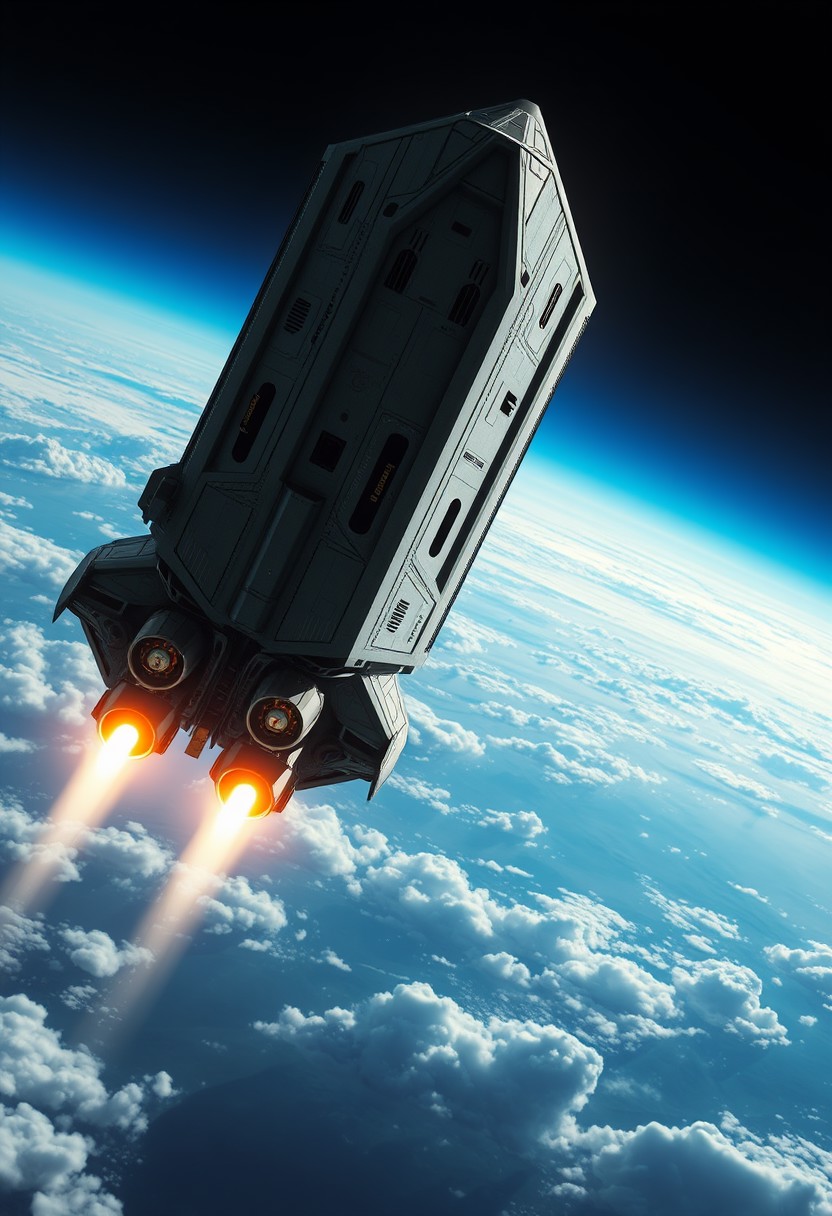 realistic, detailed spacecraft with engines enters the atmosphere of the planet, the ship is covered with re-entry layers, blue sky and clouds, soft light